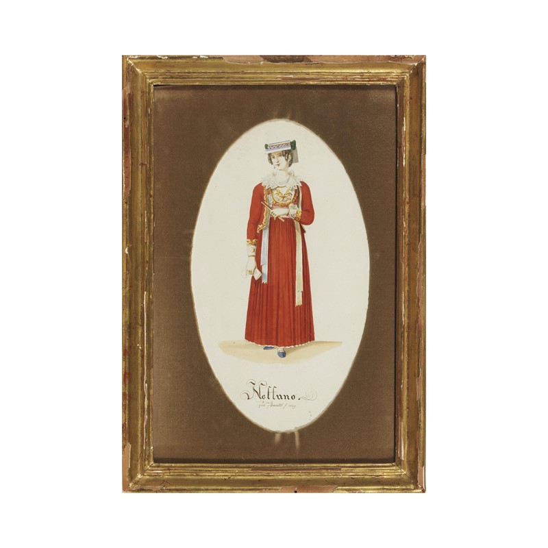 FIGURES WITH TRADITIONAL CUSTUMES two watercolors signed "Salvatore Busuttil 1829" and two watercolors with a female figure and a "saltarello romano", various measures (4)