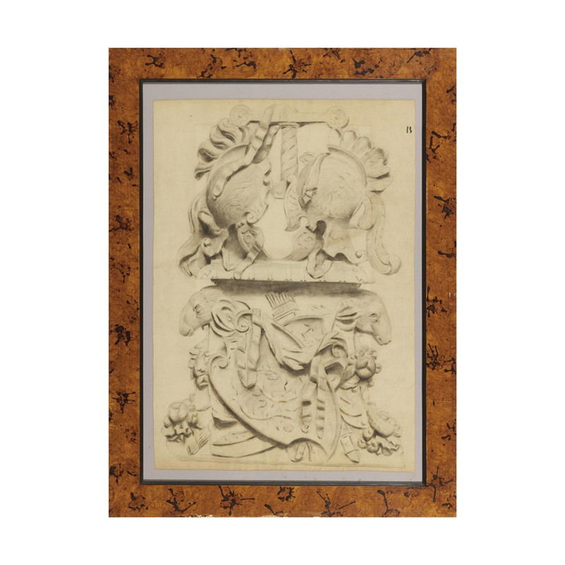 due disegni, matita nera, pennello e inchiostro acquarellato su carta vergellata, mm 575x425; matita nera su carta vergellata, mm 650x328