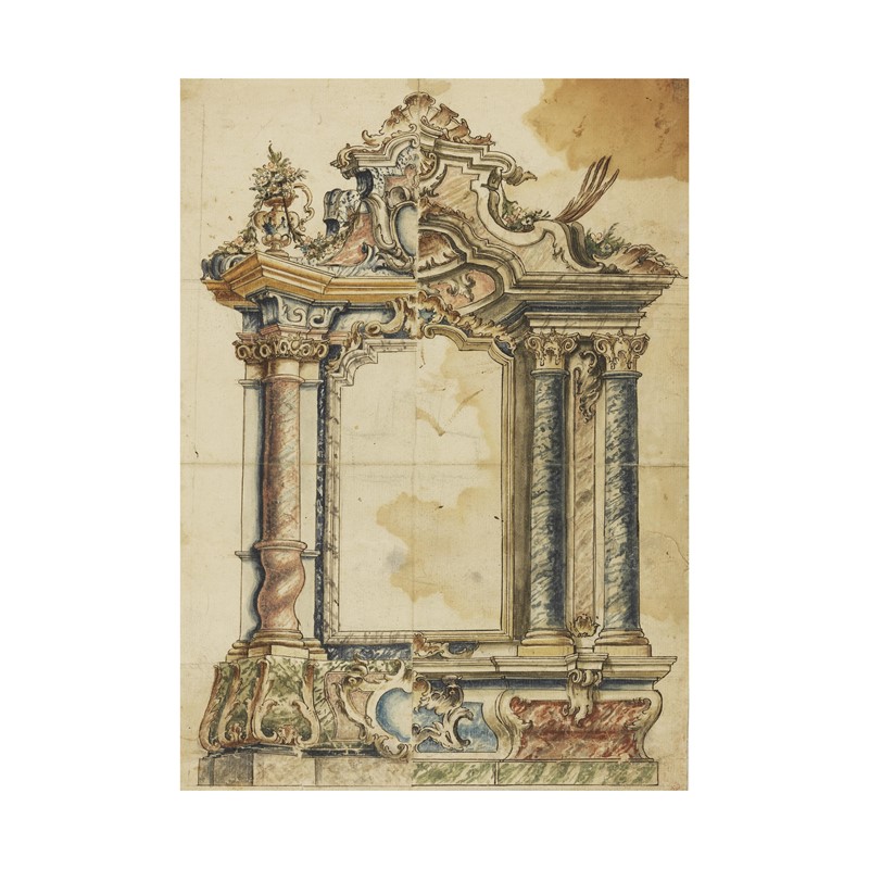 due disegni, matita nera, penna e inchiostro, pennello e inchiostri acquarellati colorati, carta vergellata, mm 505x365