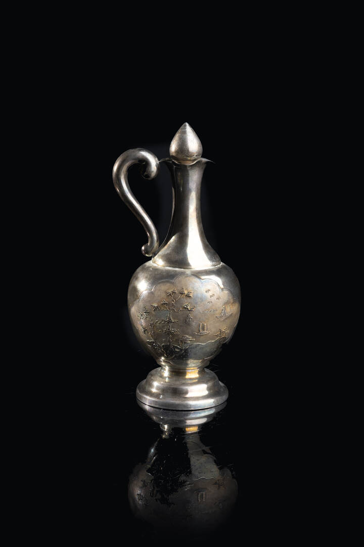 Bottiglia in argento con tappo Vietnam XX secolo. h cm 23x9