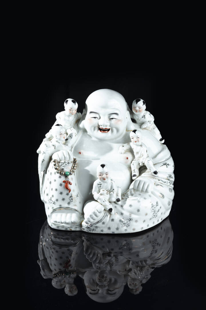 Buddha in porcellana con bambini Cina Repubblica XX secolo. h cm 29x32