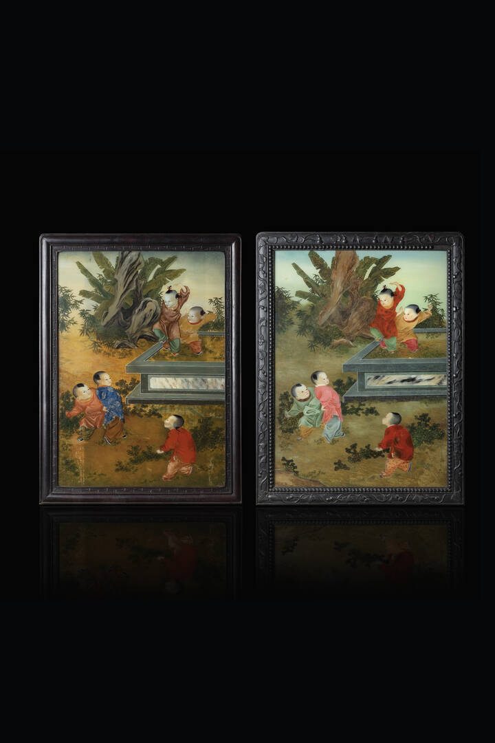 Coppia di dipinti su vetro raffigurante bambini che giocano Cina dinastia Qing [..]