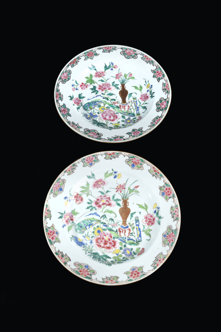 Coppia di piatti Famiglia Rosa dipinti con fiori Cina dinastia Qing XVIII secolo. [..]