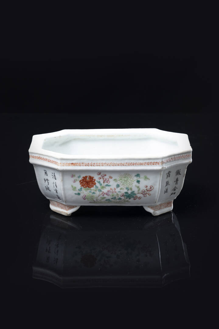 Fioriera in porcella decorata con fiori e iscrizioni Cina XIX secolo. h cm 9x22x16 5