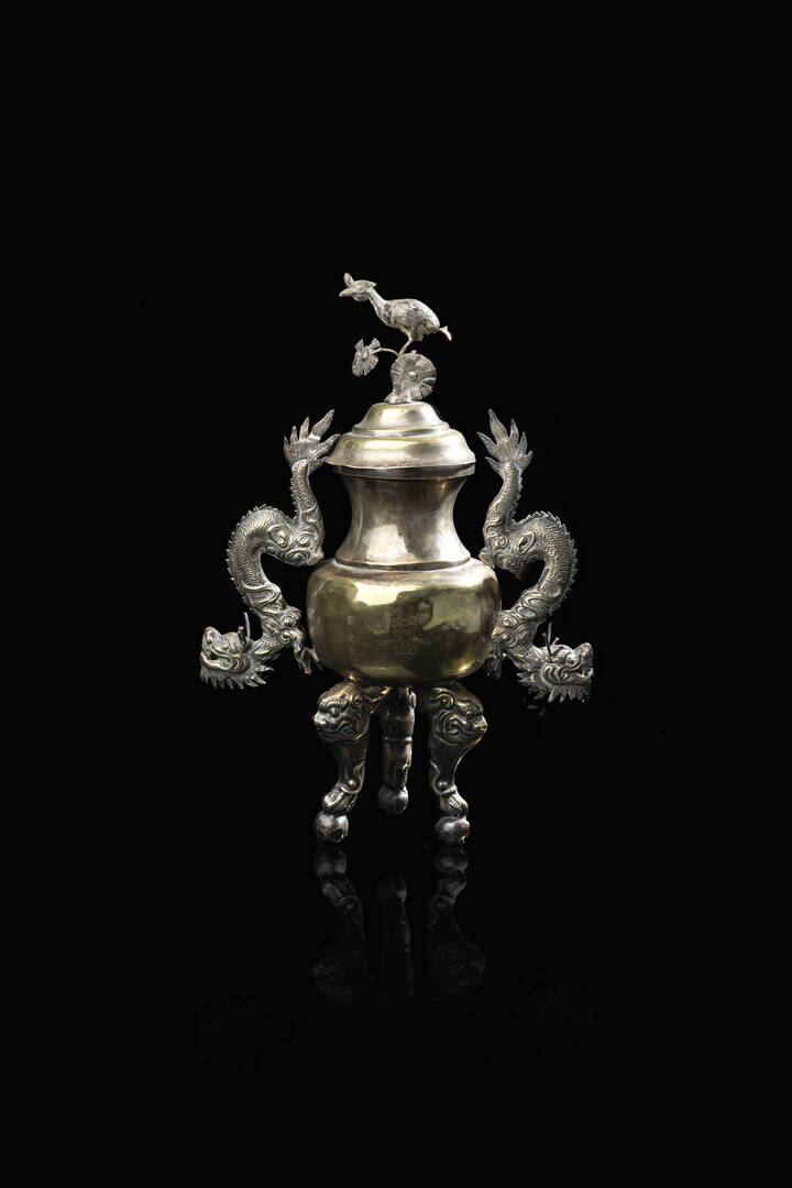 Incensiere tripode in argento con coperchio e manici a forma di drago Cina dinastia Qing XX secolo. h cm 36 5x25