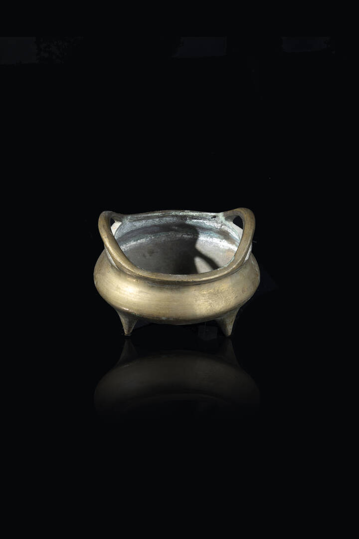 Lotto composto da cinque oggetti in bronzo Cina XVIII secolo. h cm 19x7 dignitario h cm 21x7 bambino h cm 15x11 coppa libatoria h cm 8 5x11 censer h cm 5x6 frutto
