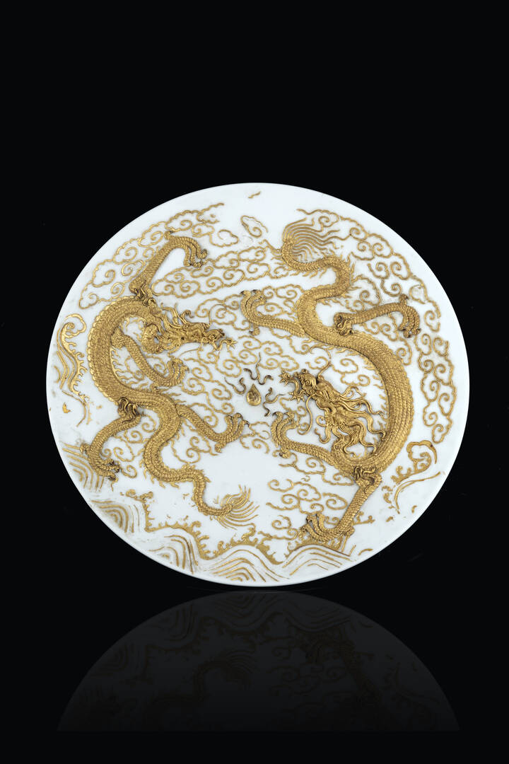 Piatto in porcellana dipinto con draghi tra le nuvole a rilievo oro Cina dinastia [..]