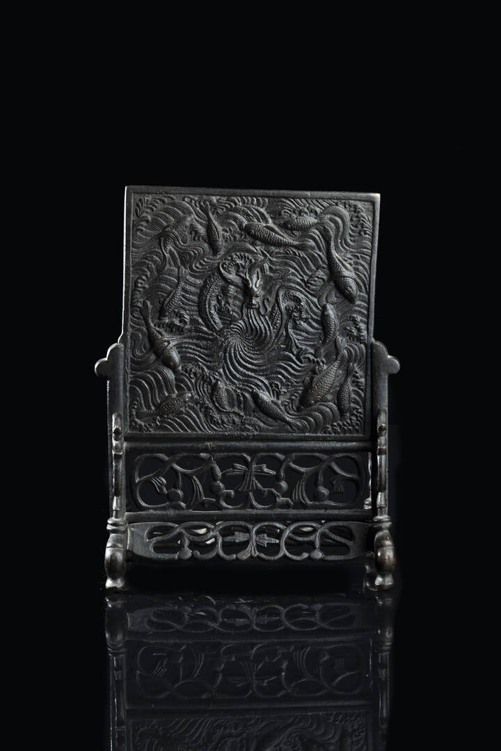 Placca in bronzo raffigurante pesci su base Cina dinastia Qing XIX secolo. h [..]