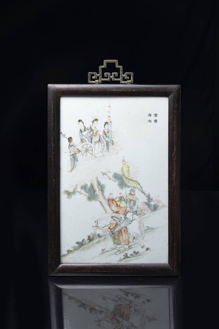 Placca in porcellana dipinta con un guerriero e figure femminili cornice in legno Cina XX secolo. h cm 38x25