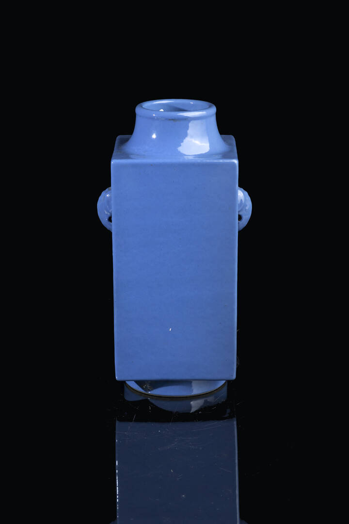 Vaso Cong in porcellana blu con manici a froma di elefante marchio apocrifo Qianlong [..]