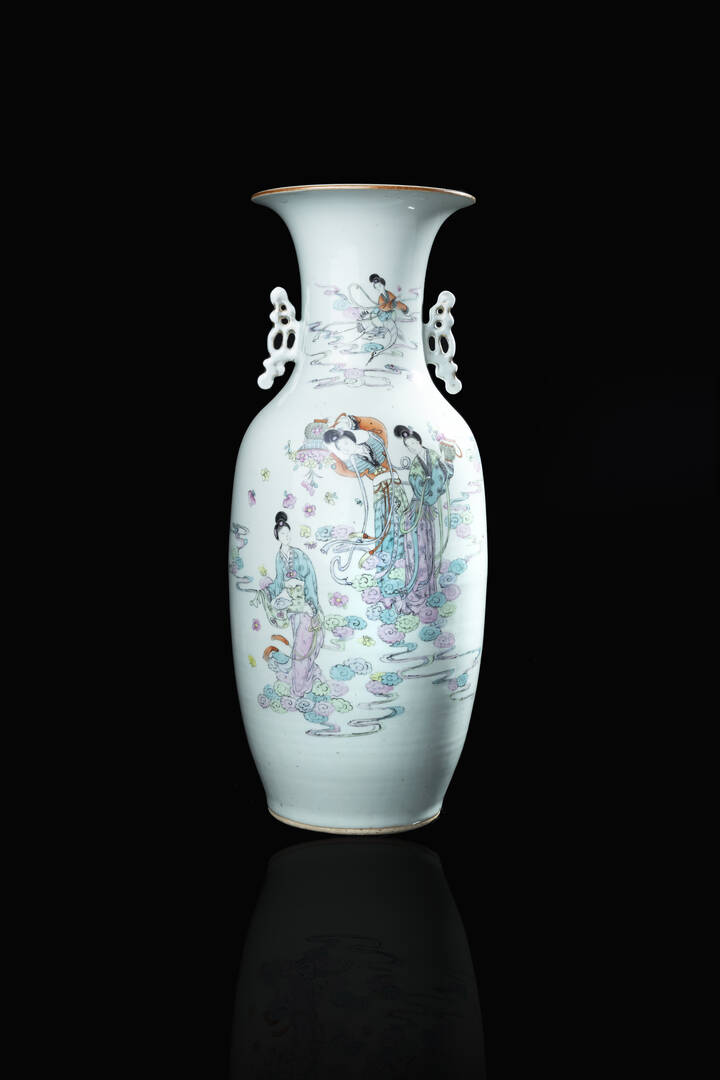 Vaso in porcellana con decori di vita quotidiana e iscrizioni Cina XX secolo. h cm 57