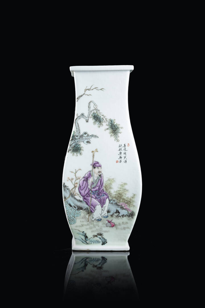 Vaso in porcellana Famiglia Rosa sezione squadrata con dipinti di saggi e iscrizioni [..]