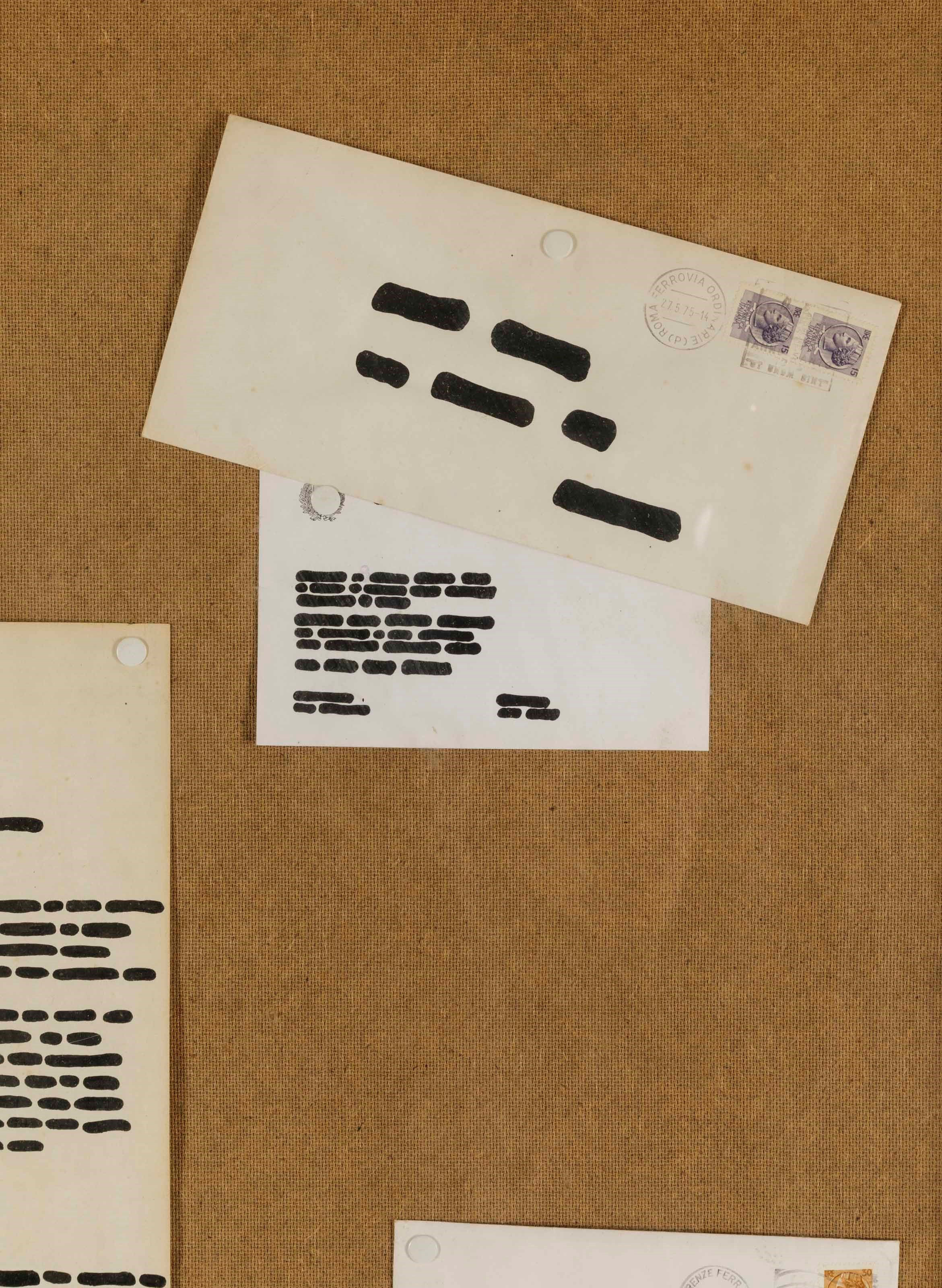 11 cancellature su carta in bacheca di faesite, Largh. 115 - Alt. 81 Cm