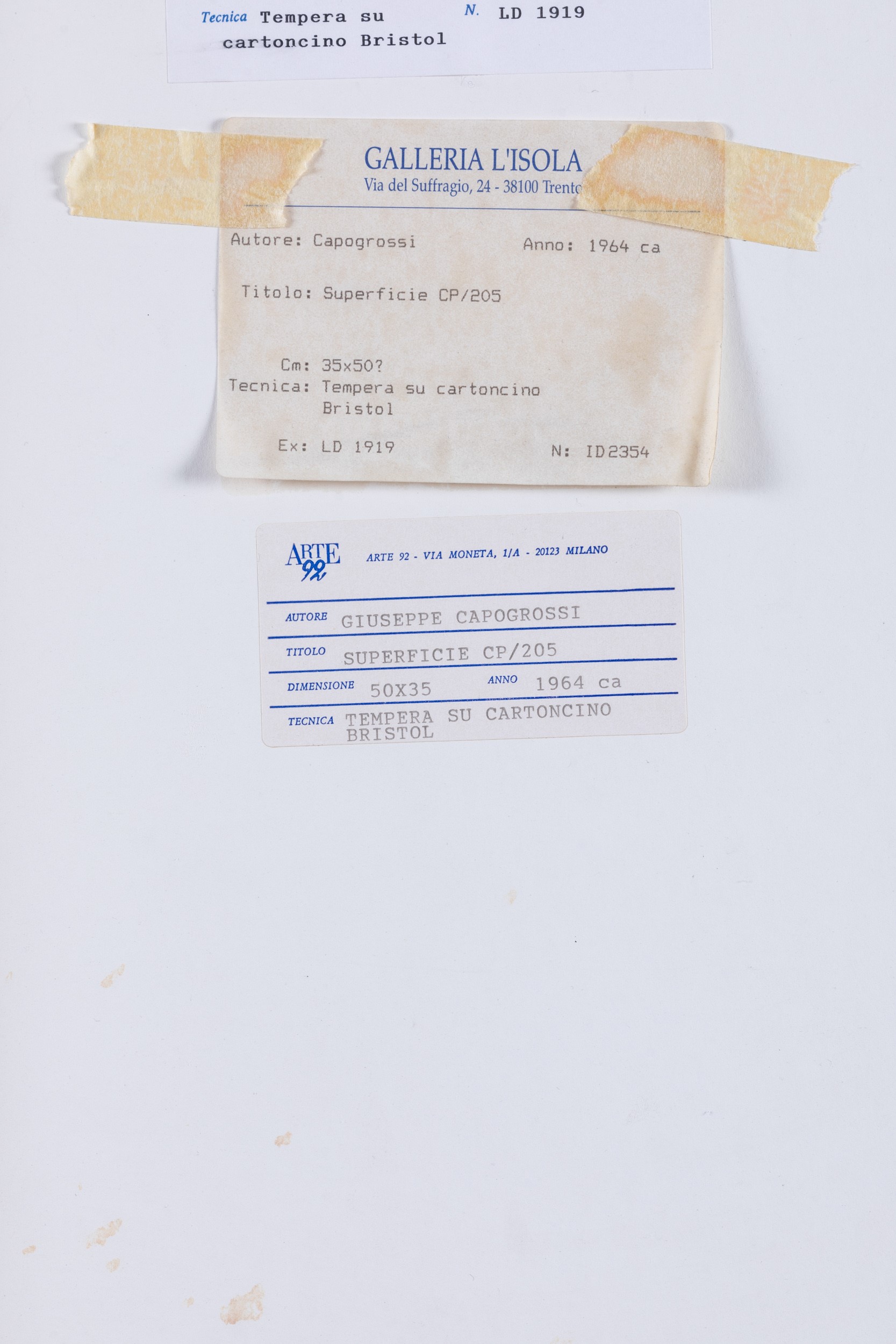 Etichetta al retro della Galleria Arte 92, Milano