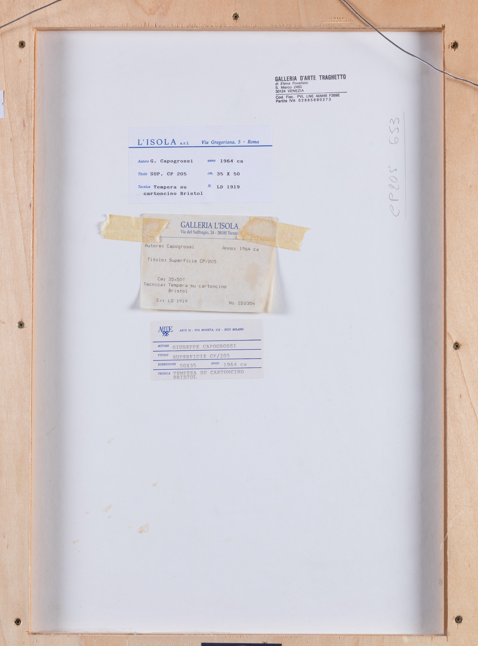 Etichetta al retro della Galleria d'arte Il Traghetto, Venezia