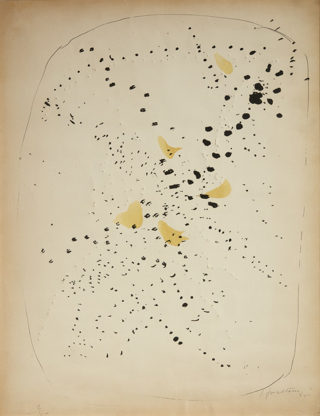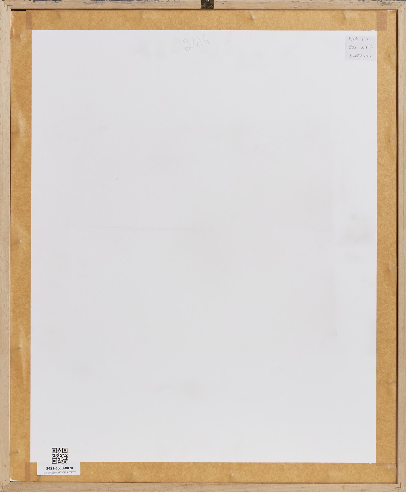 2/100. Tiratura, firma e anno in basso a matita. Grafica proveniente dalla cartella Quattro litografie. Editore: Edizioni del Cavallino, Venezia. Edizione totale: 100 esemplari (+10). Pubblicazione: Lucio Fontana. Incisioni, grafica, multipli, pubblicazioni... a cura di Harry Ruhé e Camillo Rigo, L-8. Lievi difetti.