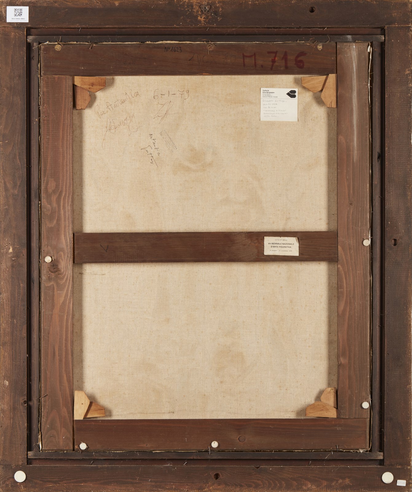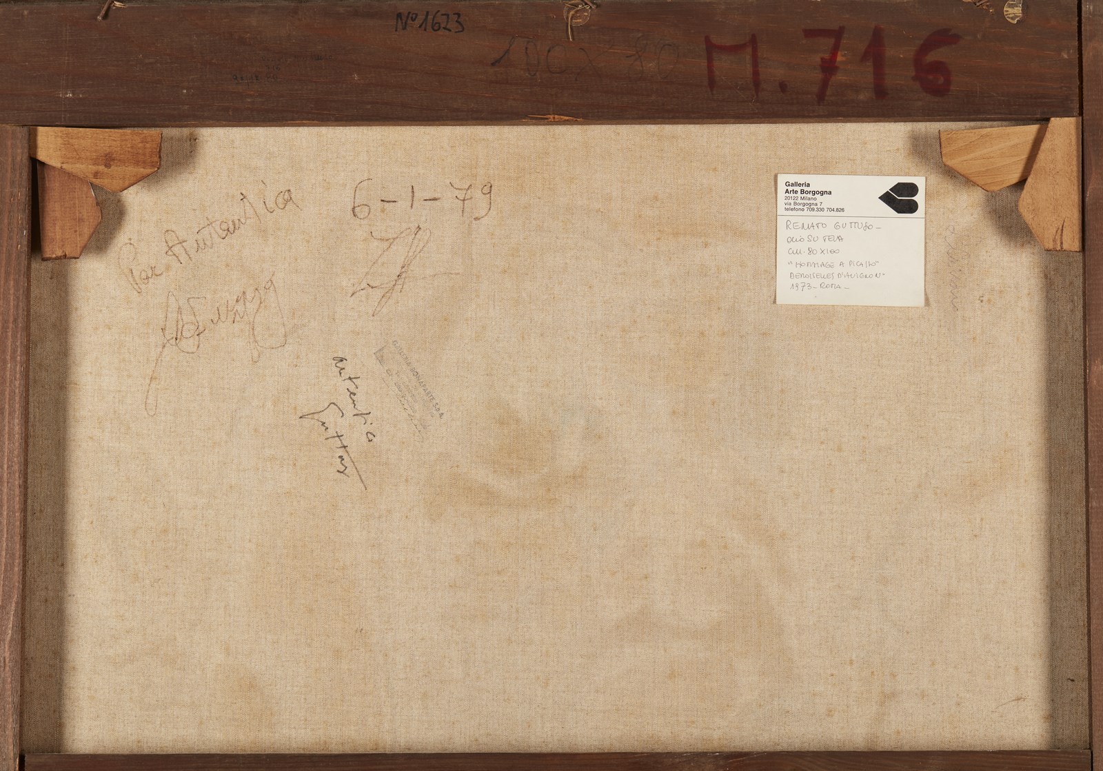 Firma e anno in basso a destra. Al retro firma per autentica e cartiglio descrittivo Galleria arte Borgogna, Milano. Autentica dell'artista su fotografia con timbro Galleria Bonaparte, Milano. Autentica su fotografia della Galleria Borgogna, Milano. Pubblicazione: Catalogo generale dei dipinti di Renato Guttuso, Volume III, a cura di Enrico Crispolti, Giorgio Mondadori & Associati Editore, 1985, p.184, tav. 73/34- Rinascita, n.42, a.30, Roma 1973- Bildende Hunst, Berlino, 6/1975, p.266, fig. 7- Catalogo Bolaffi, 1978, Volume I, p.136. Esposizioni: Hertz, 1973- Francoforte, 1974-1975- Berlino, 1975- Todi, 1976- Sofia, 1976- La Colomba, 1977. Provenienza: Galleria Bonaparte, Milano- Galleria Borgogna, Milano- Collezione Privata, Milano.