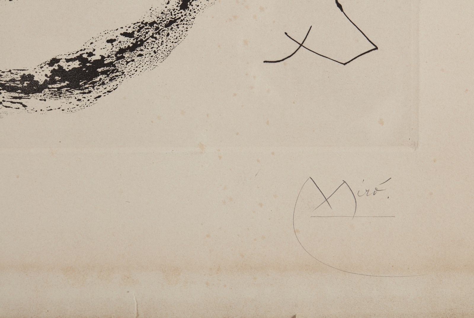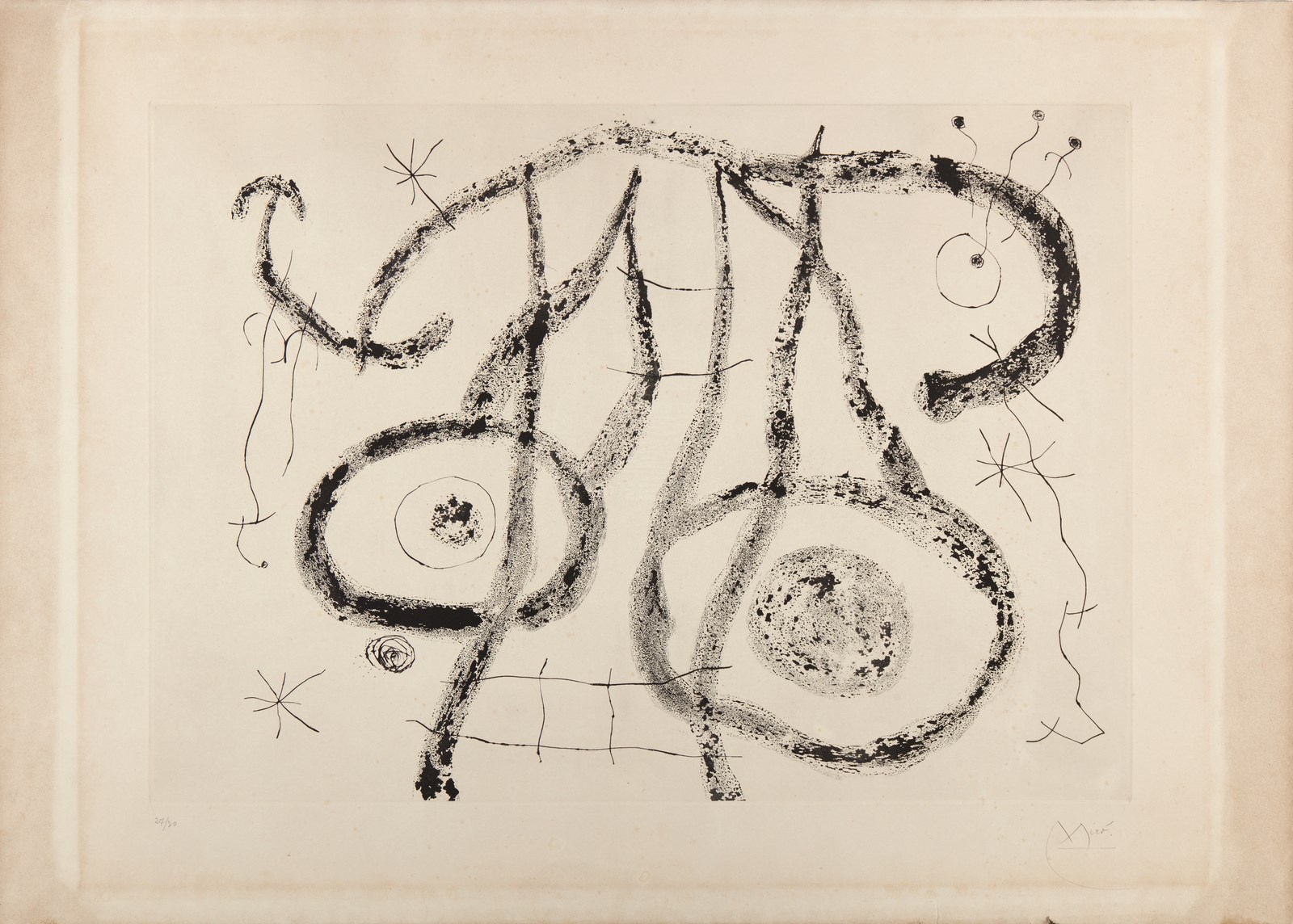 27/30. Tiratura e firma in basso a matita. Dimensioni lastra: 57x79cm. Carta Rives. Edizione totale: 30 esemplari firmati e numerati + alcuni esemplari fuori commercio firmati. Editore: Maeght, Parigi. Stampatore: Maeght, Levallois - Perret. Pubblicazione: Miṛ - Incisioni, 1961-1973, Volume II, Jacques Dupin, Daniel Lelon Editore, p.39, tav. 341. Difetti.