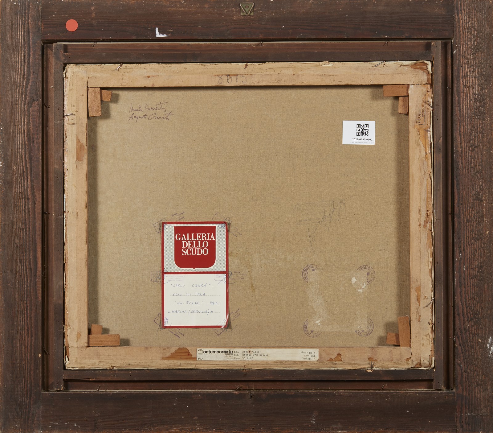 Firma e anno in basso a destra. Al retro cartiglio Galleria Contemporarte, Firenze, timbro Galleria della Spiga, Milano, e cartiglio Galleria dello Scudo, Verona. Pubblicazione: Carrà, Tutta l'opera pittorica 1951-1966, Volume III, a cura di Massimo Carrà, Milano,1968, n.33/61. Provenienza: Galleria della Spiga, Milano- Galleria dello Scudo, Verona- Galleria Contemporarte, Firenze- Collezione privata, Teramo. Autentica su fotografia di Massimo Carrà riportante il relativo numero d'inventario e il timbro della Galleria dello Scudo. Opera archiviata presso l'Archivio Carlo Carrà - Luca Carrà, Milano, come da documentazione fotografica allegata all'opera riportante il relativo numero d'inventario. Lievi difetti.