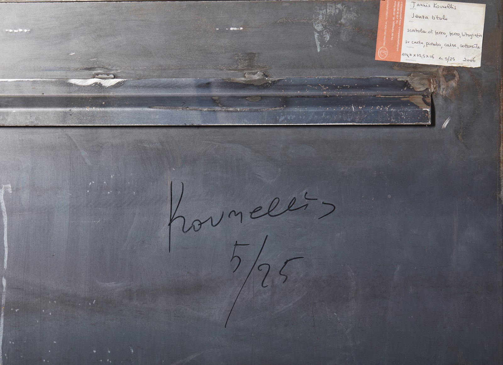 5/25. Al retro firma e tiratura. Pubblicazione: Jannis Kounellis. Edizioni, Galleria dell'Oca, Roma, 2007, pp. 19, 78. Editore Galleria dell'Oca, Roma. Provenienza: Collezione privata, Roma. Esposizione: Galleria dell'Oca, Roma, Novembre 2006. L'opera fu pensata e realizzata in occasione di questa mostra. Una retrospettiva particolare in cui il lavoro dell’artista, dal 1970 al 2006, viene raccontato attraverso diciannove iron cases, scatole in ferro edite in venticinque copie. Multipli che in realtà sono pezzi unici: infatti, le venticinque scatole, sono una diversa dall'altra e non vi è ripetizione. Difetti.