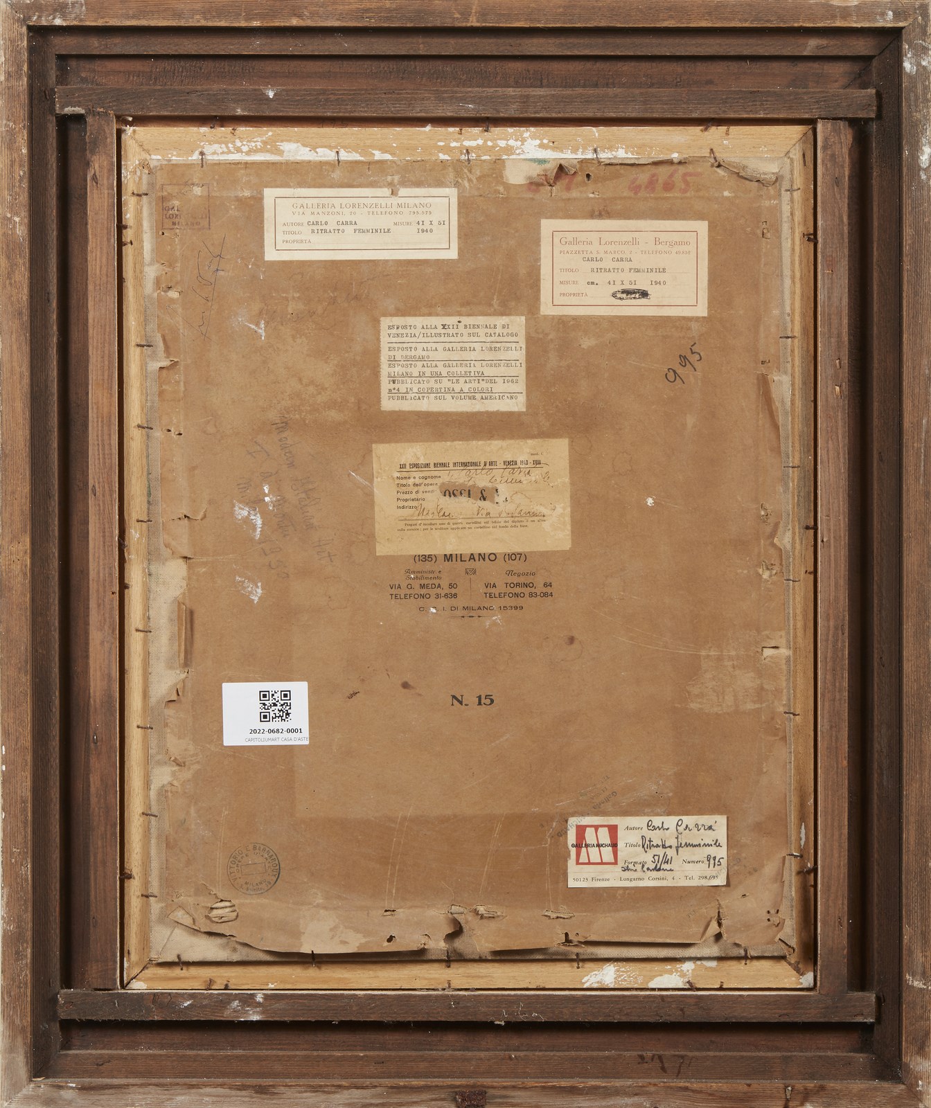 Firma e anno in basso a sinistra. Al retro cartiglio descrittivo Galleria Lorenzelli, Milano- Galleria Lorenzelli, Bergamo- Galleria Muchino, Firenze, e cartiglio espositivo della XXII Biennale di Venezia. Pubblicazione: Carrà, Edizioni dell'Annunciata - Edizioni della Conchiglia, p.393, tav. 34/40- Carrà, G. Marussi, Le Arti, Milano, 1962- Esposizione Biennale Internazionale d'Arte: catalogo, 2. ed., Venezia, 1940, p. 133. Esposizioni: Galleria Lorenzelli, Milano- Galleria Lorenzelli, Bergamo- XXII Biennale, Venezia. Provenienza: Collezione privata, Cene (Bergamo)- Galleria Lorenzelli, Milano- Galleria Lorenzelli, Bergamo- Galleria Muchino, Firenze- Collezione privata, Teramo. Si ringrazia Luca Carrà per aver confermato l'autenticità dell'opera. Lievi difetti.