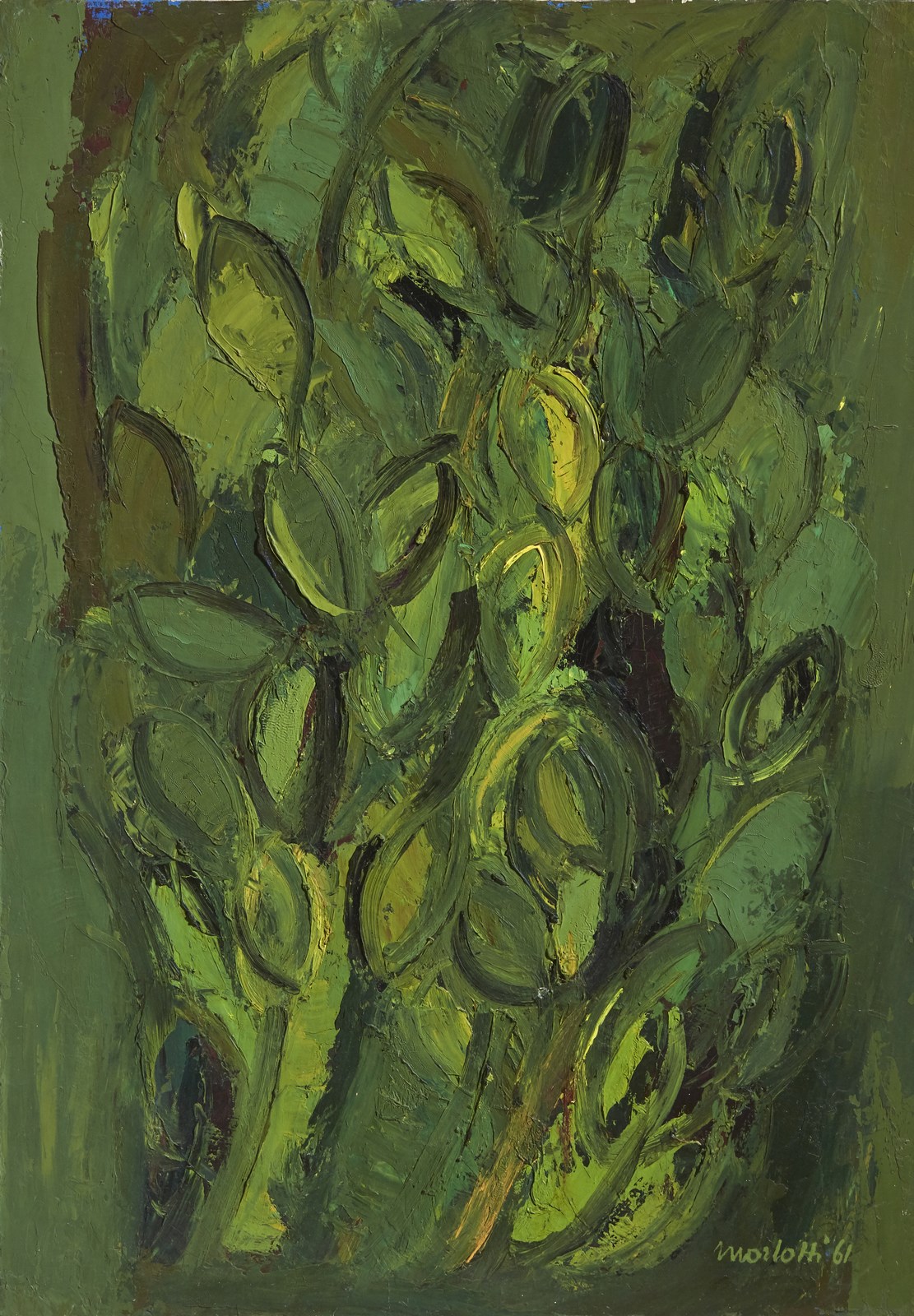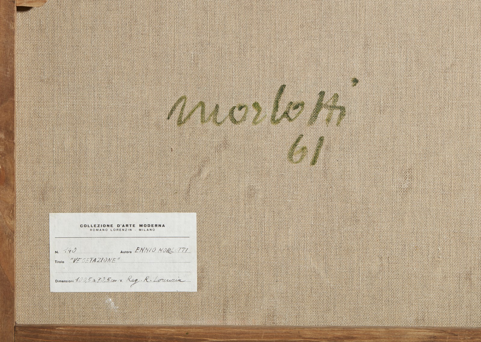 Firma e anno in basso a destra. Opera archiviata presso l'Associazione Ennio Morlotti, Milano, come da documentazione fotografica allegata all'opera riportante il relativo numero d'inventario. Pubblicazione: Morlotti, Edizioni Galleria Il Castello, Milano, pp.40-41. Lievi difetti.