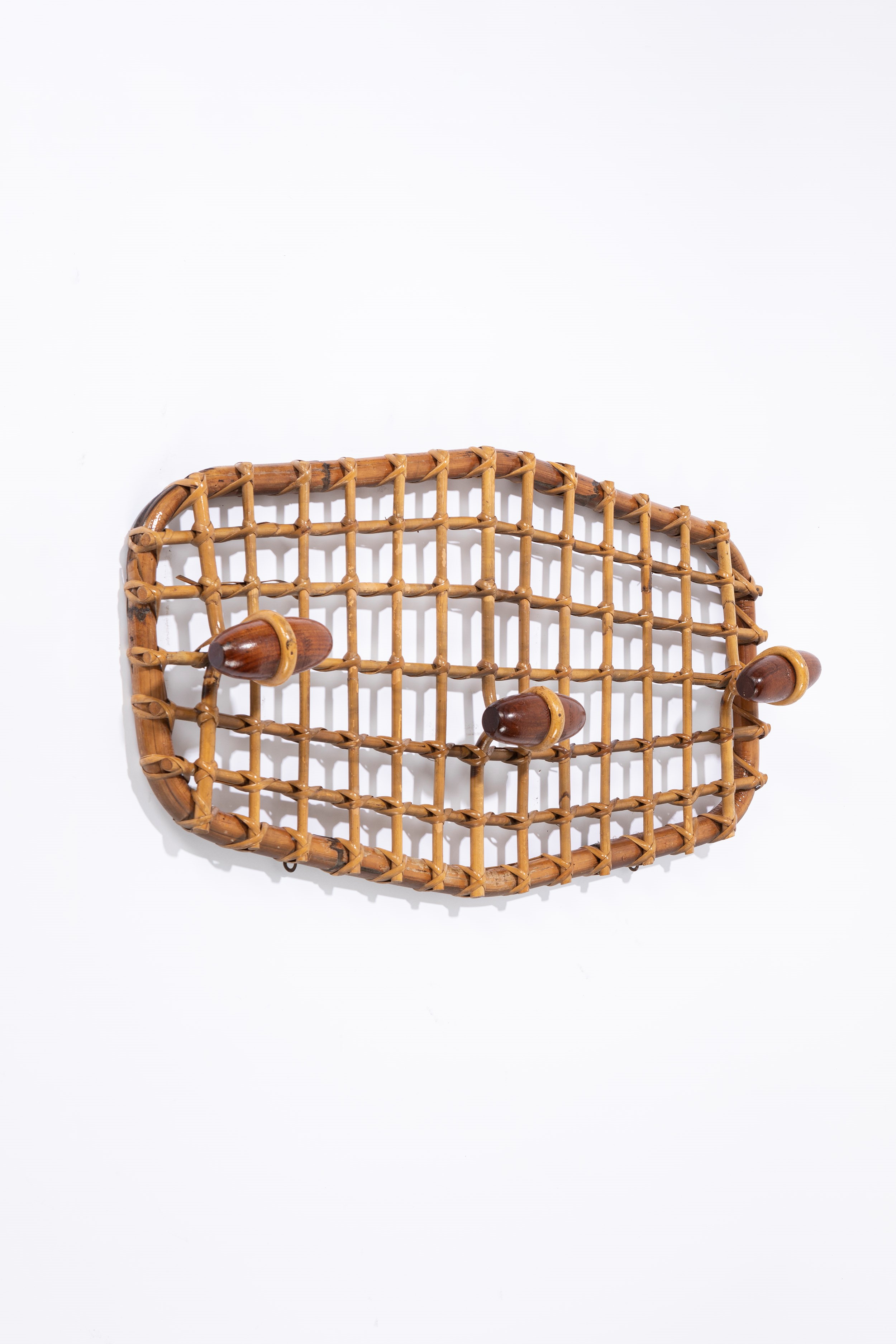 1950 ca. struttura in canna d’India e rattan intrecciato. 3 appendini in legno sagomati.