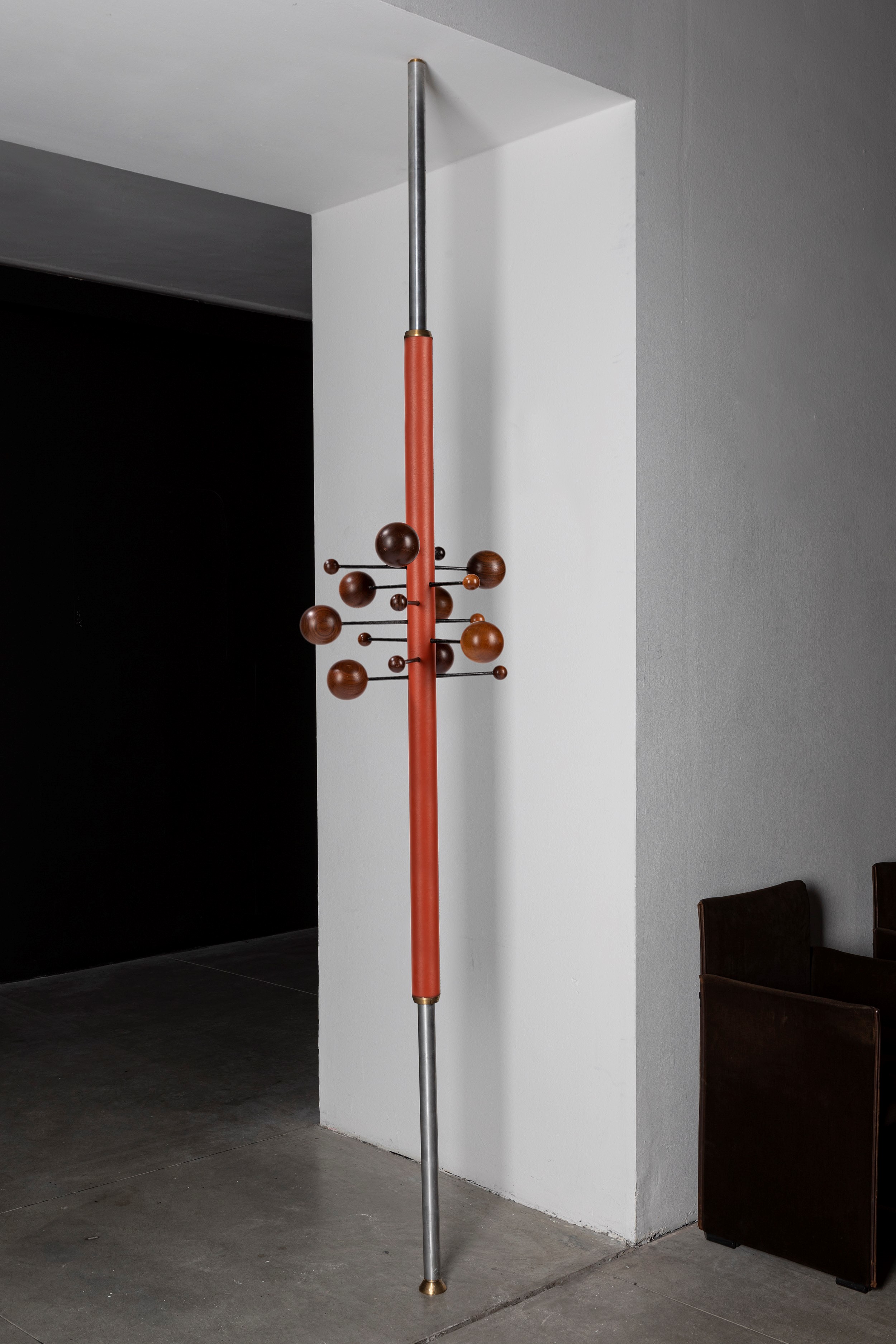 1961 alluminio brillantato e acciaio inox spazzolato, sfere in legno massello di faggio.