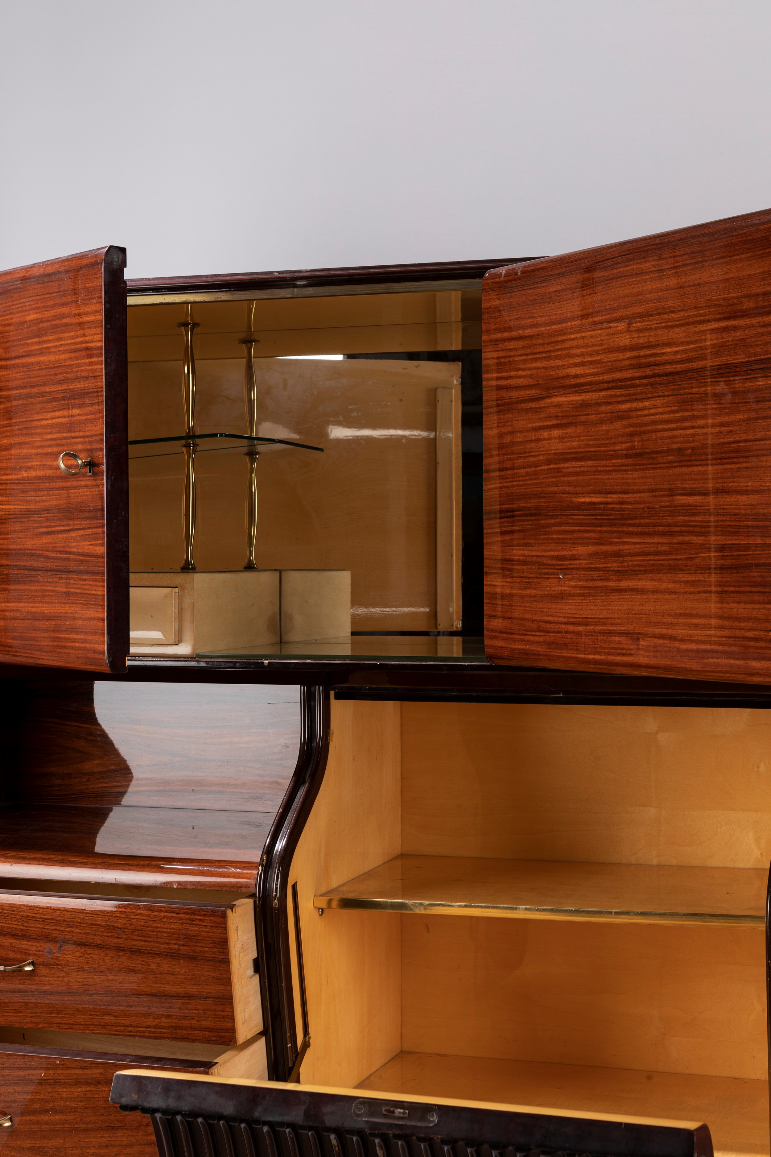 1940 ca. legno massello e impiallacciato, guarnizioni in ottone, interni in acero con scomparto bar a vetri.