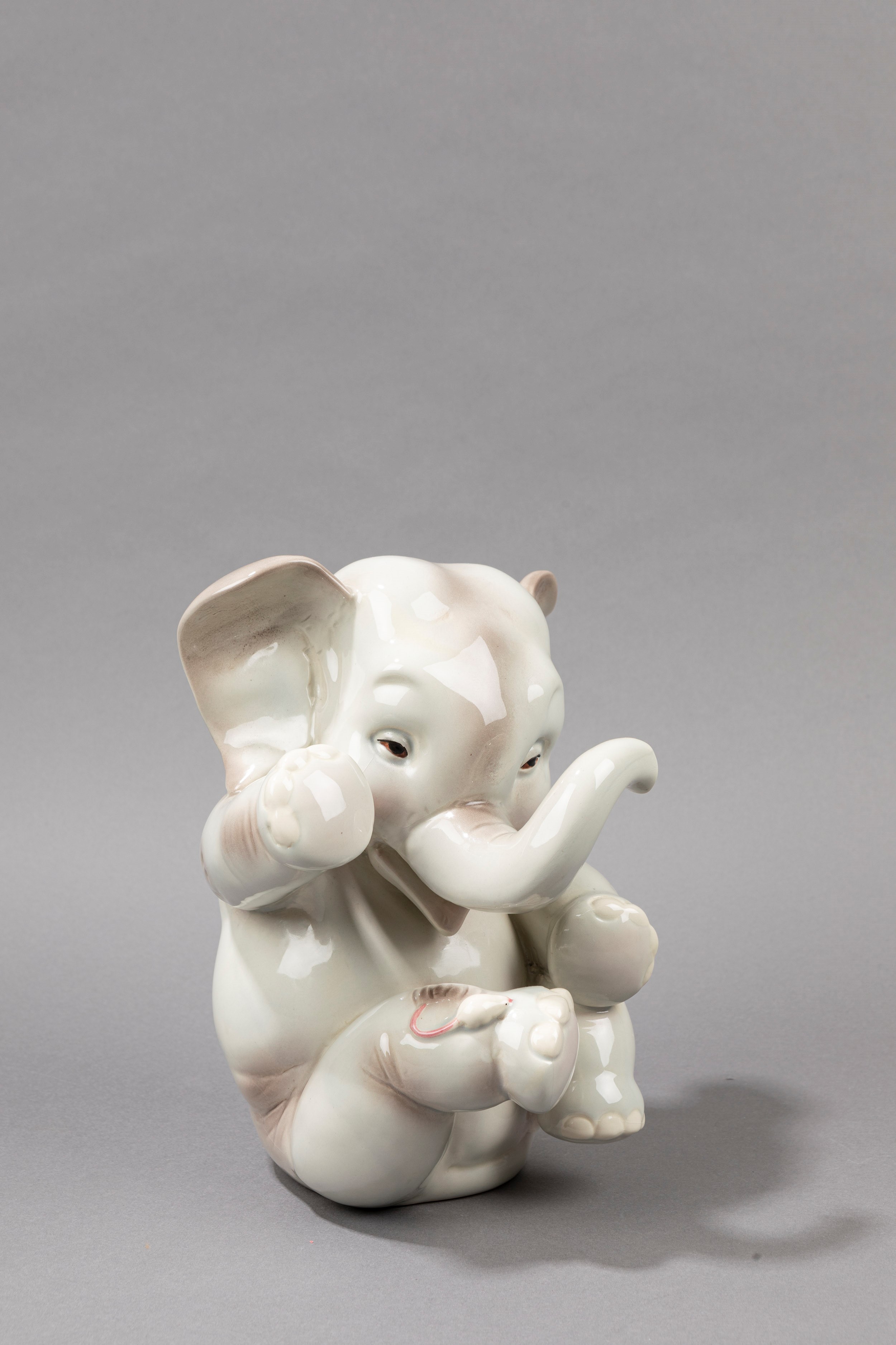Scultura in porcellana policroma raffigurante elefante con topolino. Marchio Lenci Made in Italy Torino sotto la base.