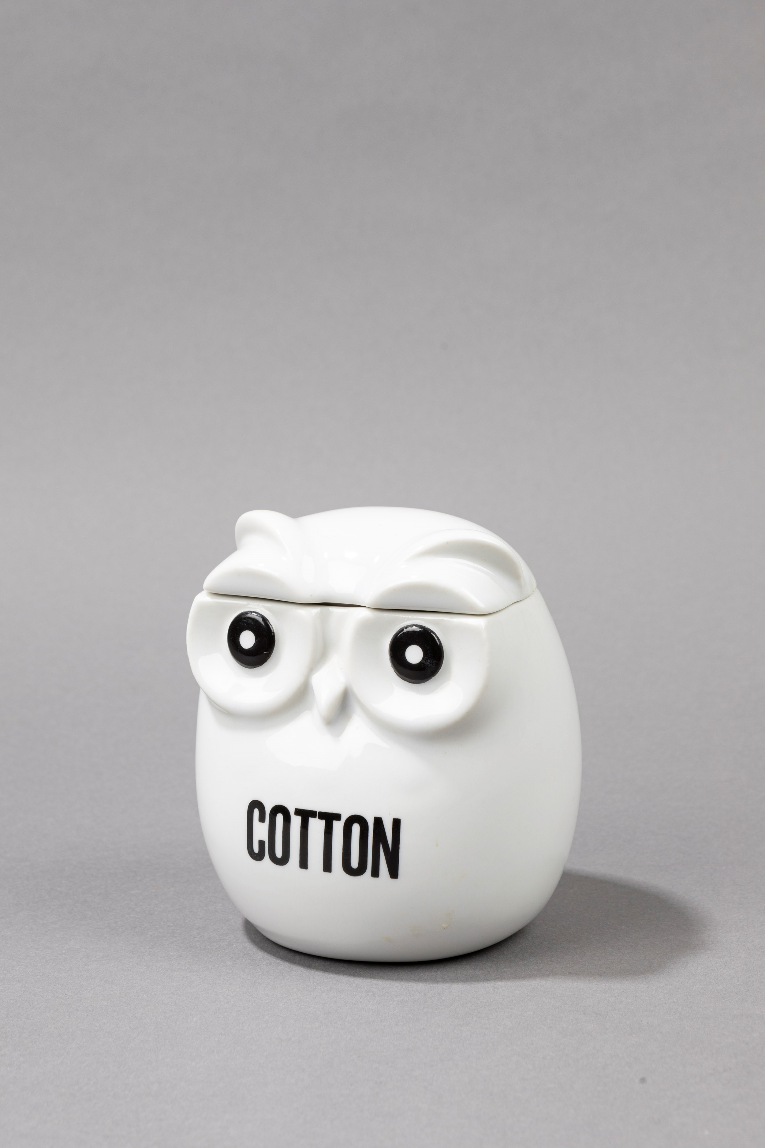 1950 ca. contenitore portacotone in ceramica serigrafata.