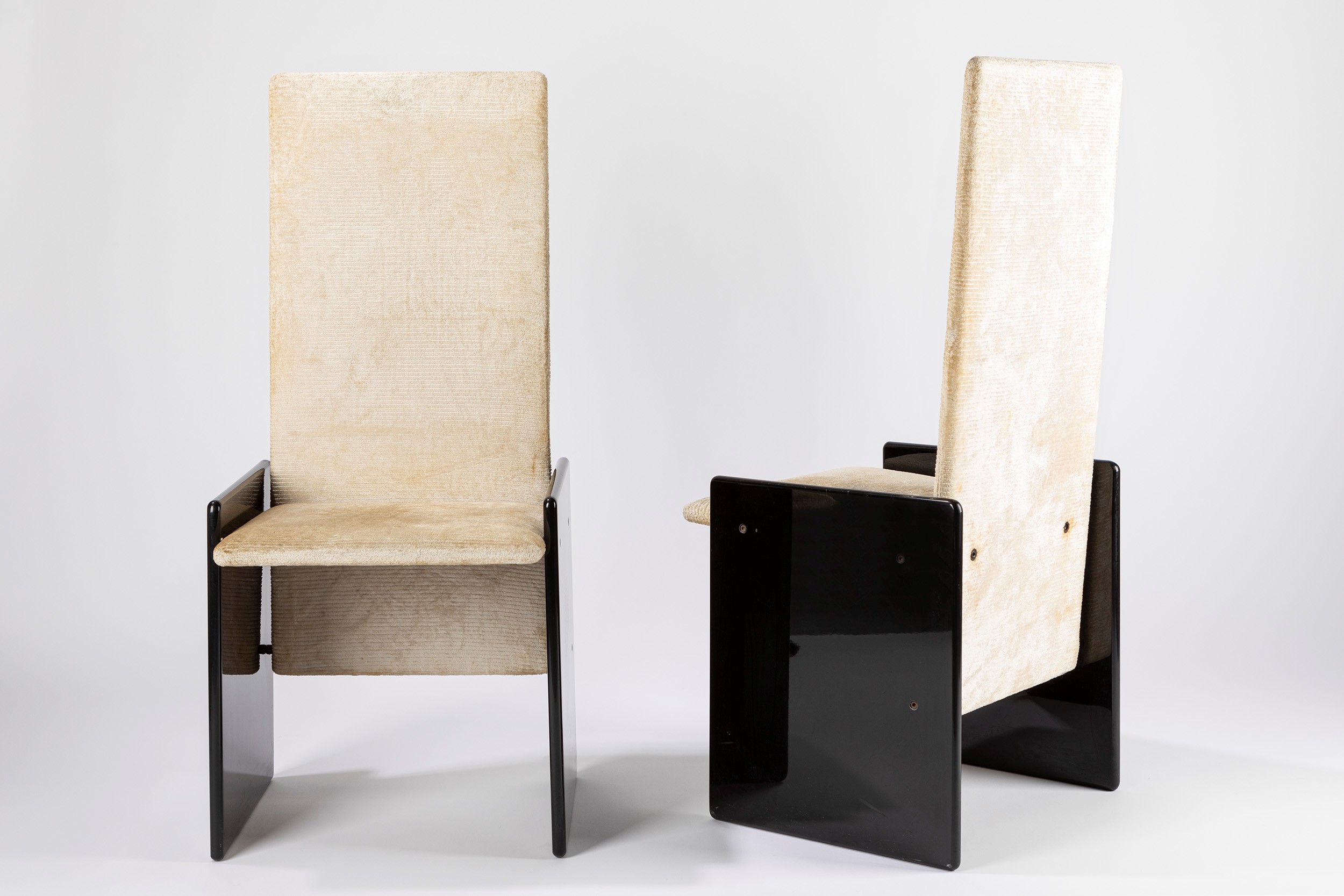 1969 quattro sedie in legno laccato nero e velluto color ghiaccio.