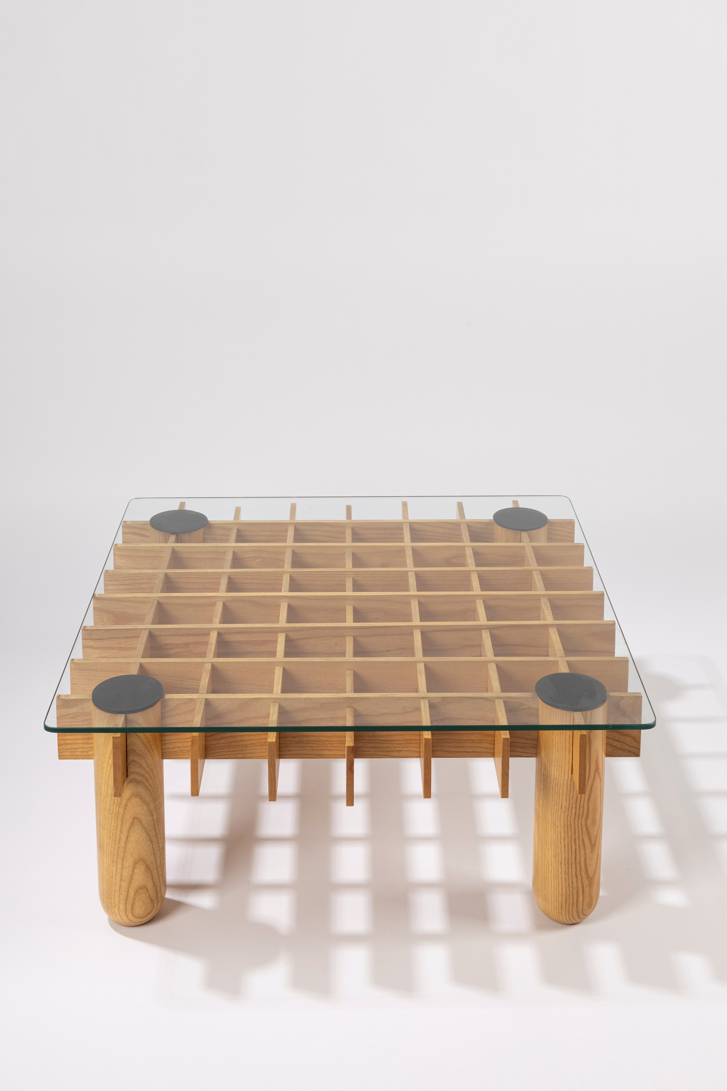 Tavolino in legno a incastro e piano in vetro. Produzione Ghianda, distribuito da Knoll International.
