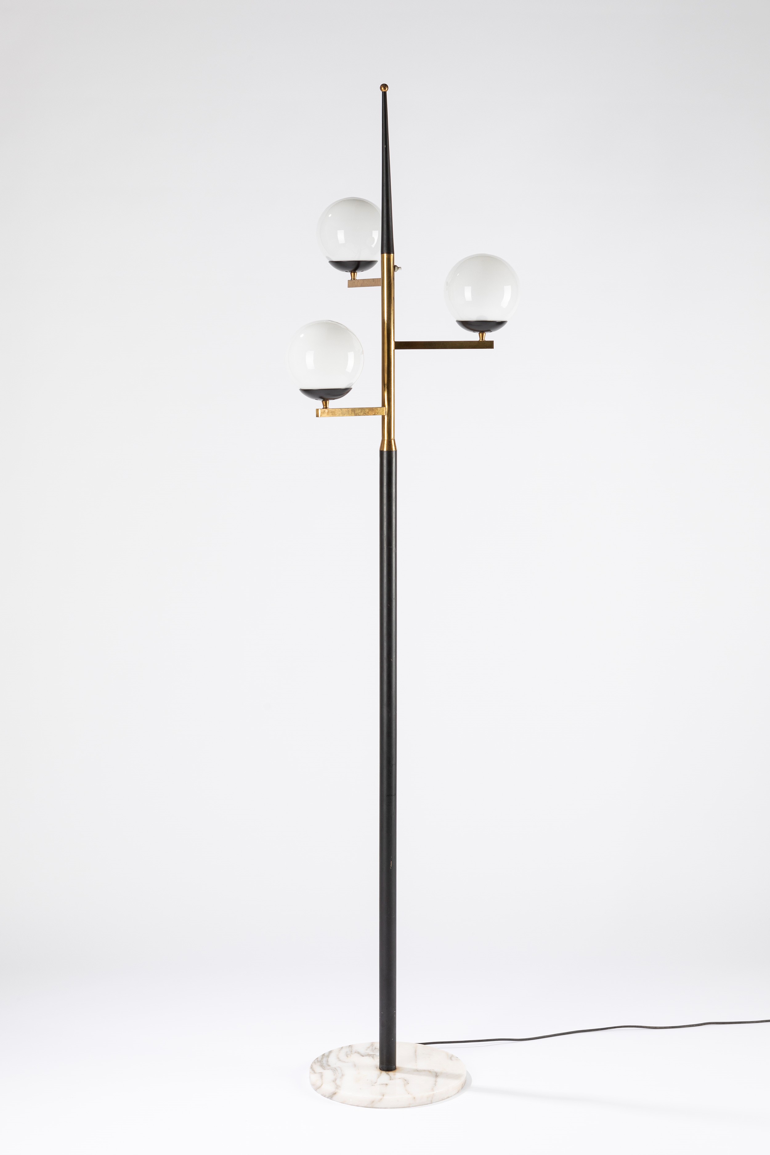 base in marmo, fusto in acciaio nero laccato, ottone, tre diffusori sferici in vetro opalino lucido.