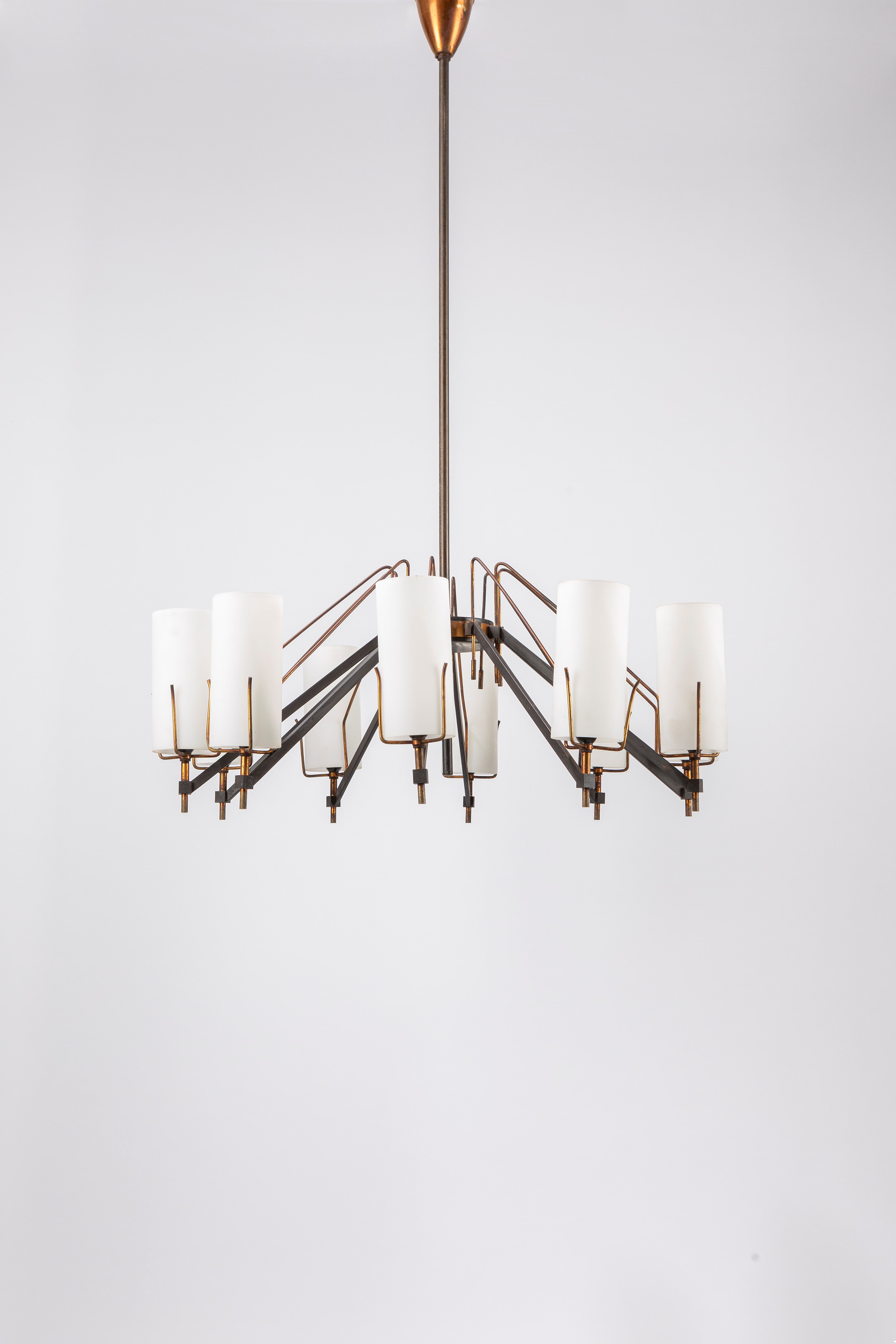 a dieci luci con struttura in legno, ottone e metallo verniciato. Diffusori in vetro opalino satinato.