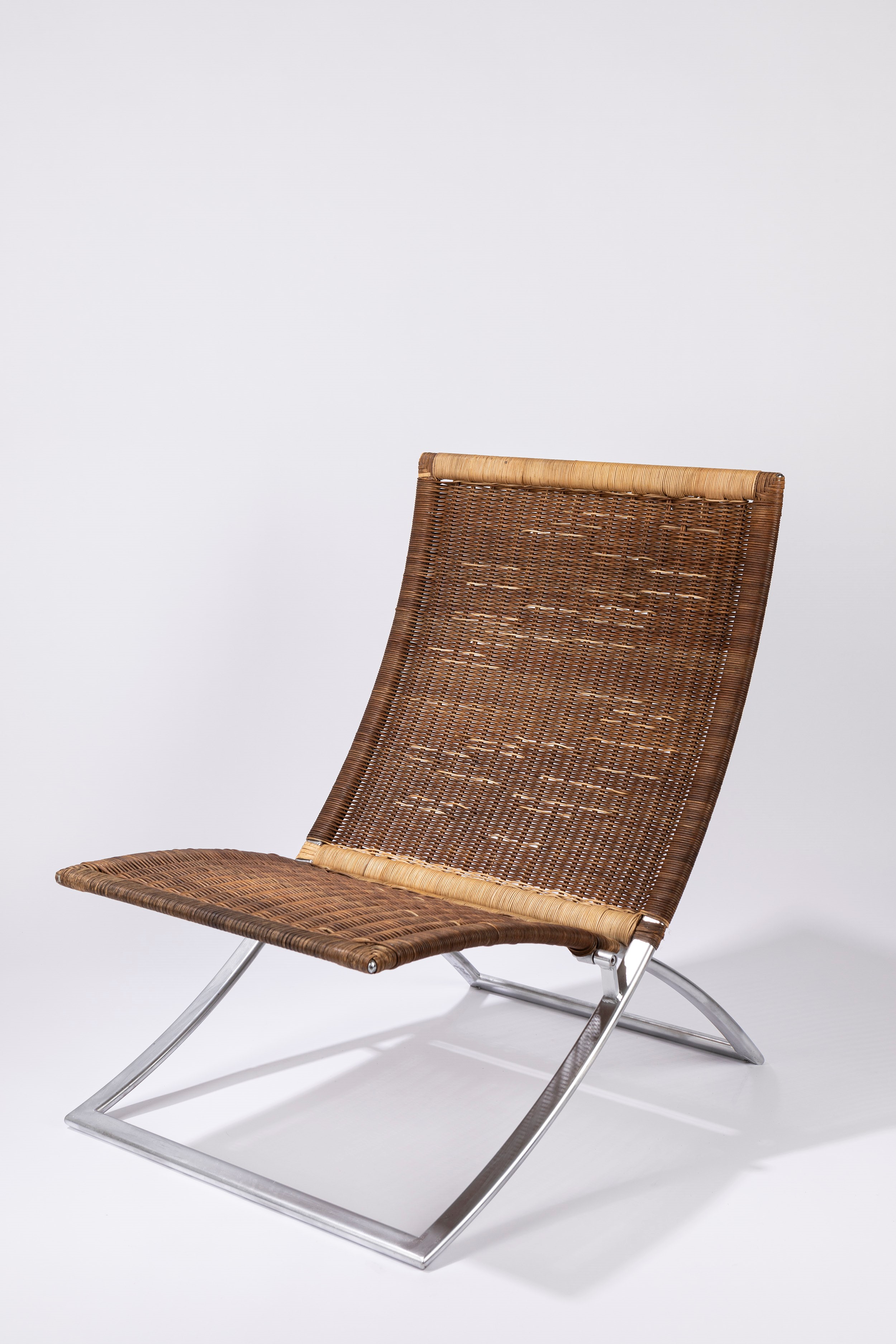 Poltrona in acciaio cromato. Sedile e schienale in rattan. Produzione Mobel.