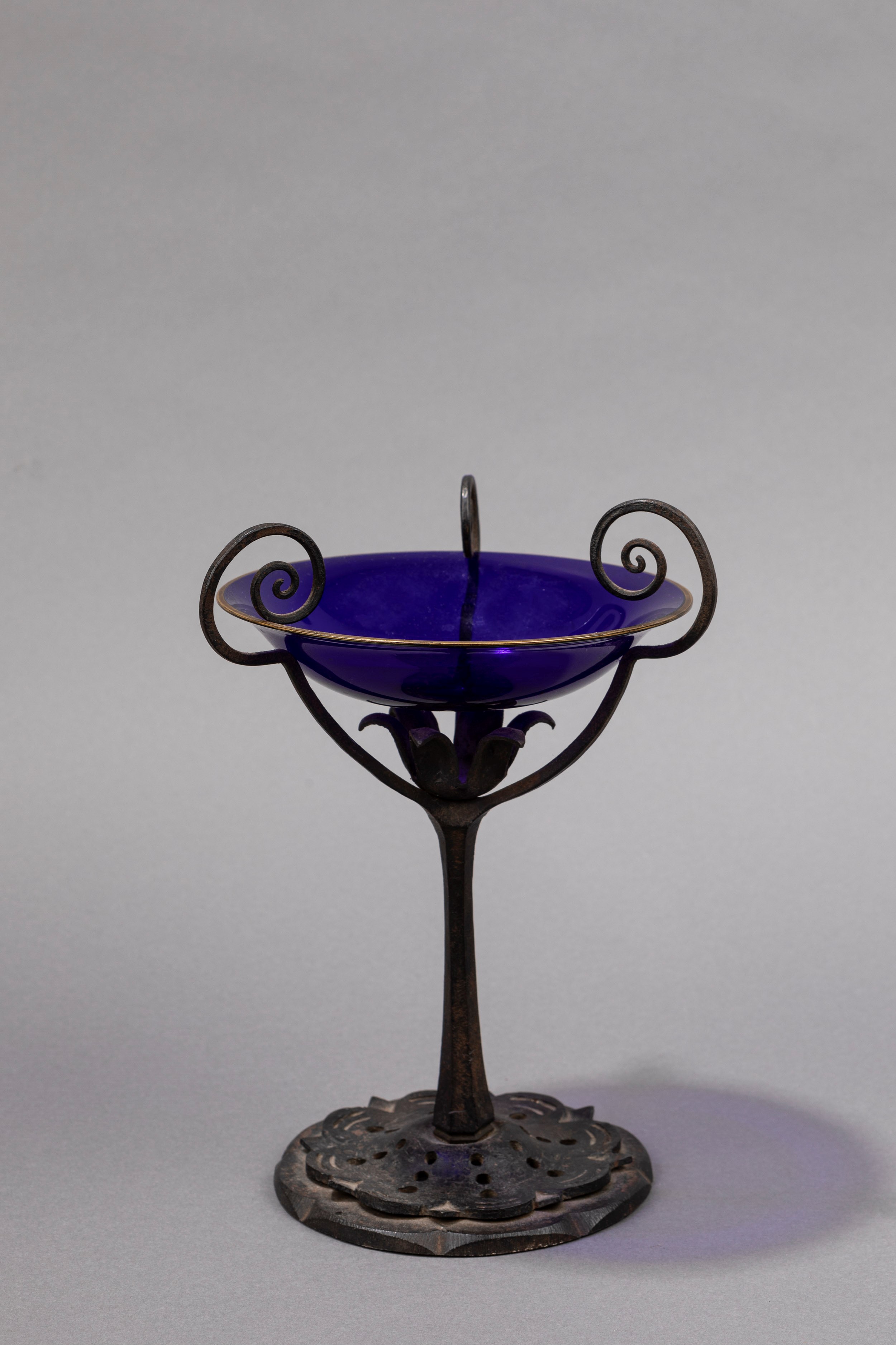 Connubio vetro e ferro lavorato; coppa in vetro soffiato di Murano.