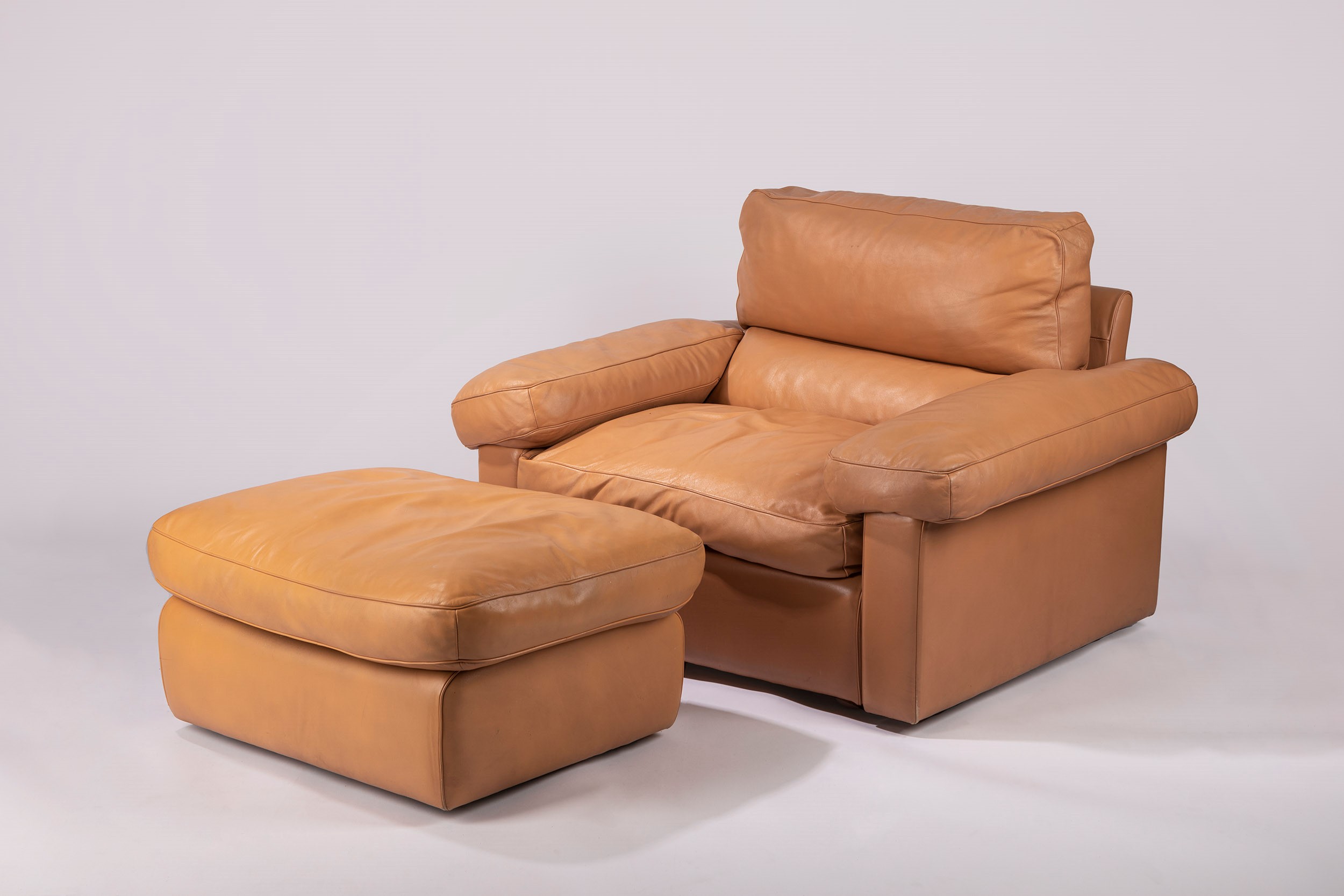 1970 ca. Poltrona in pelle color senape con poggiapiedi.