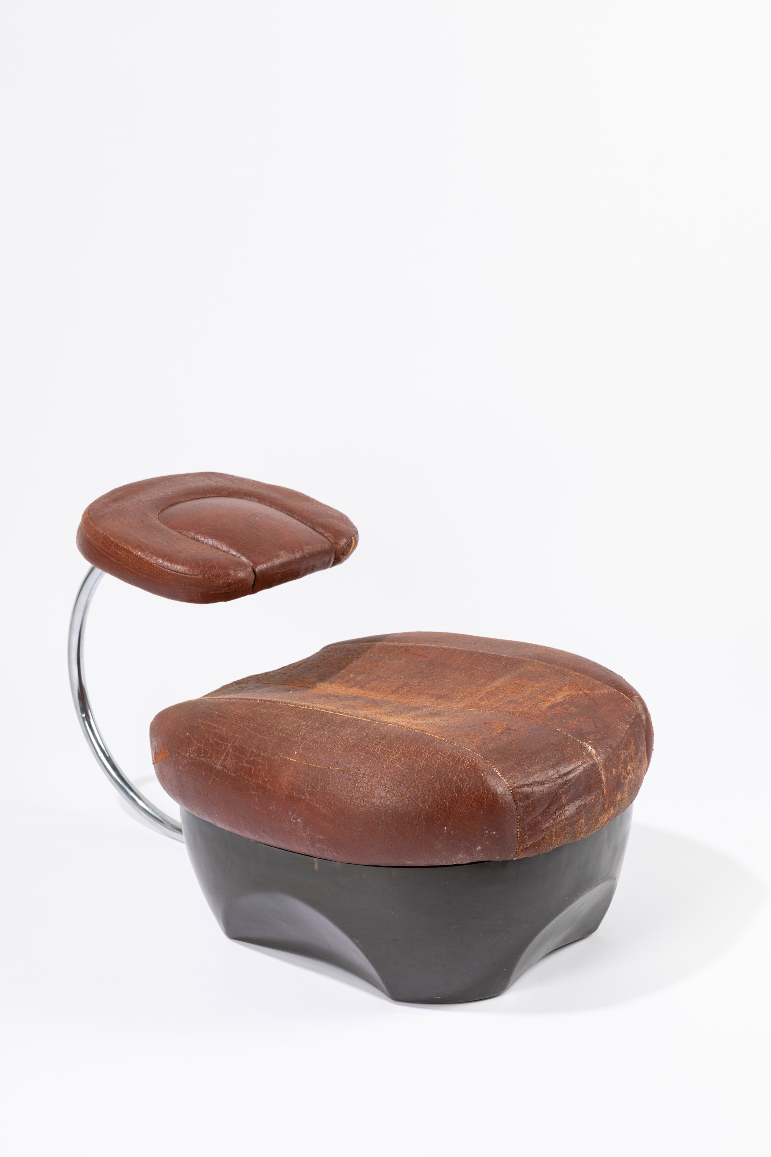 Poltrona con sedile in pelle e acciaio con basamento in resina. Prima Serie. Produzione Zanotta.