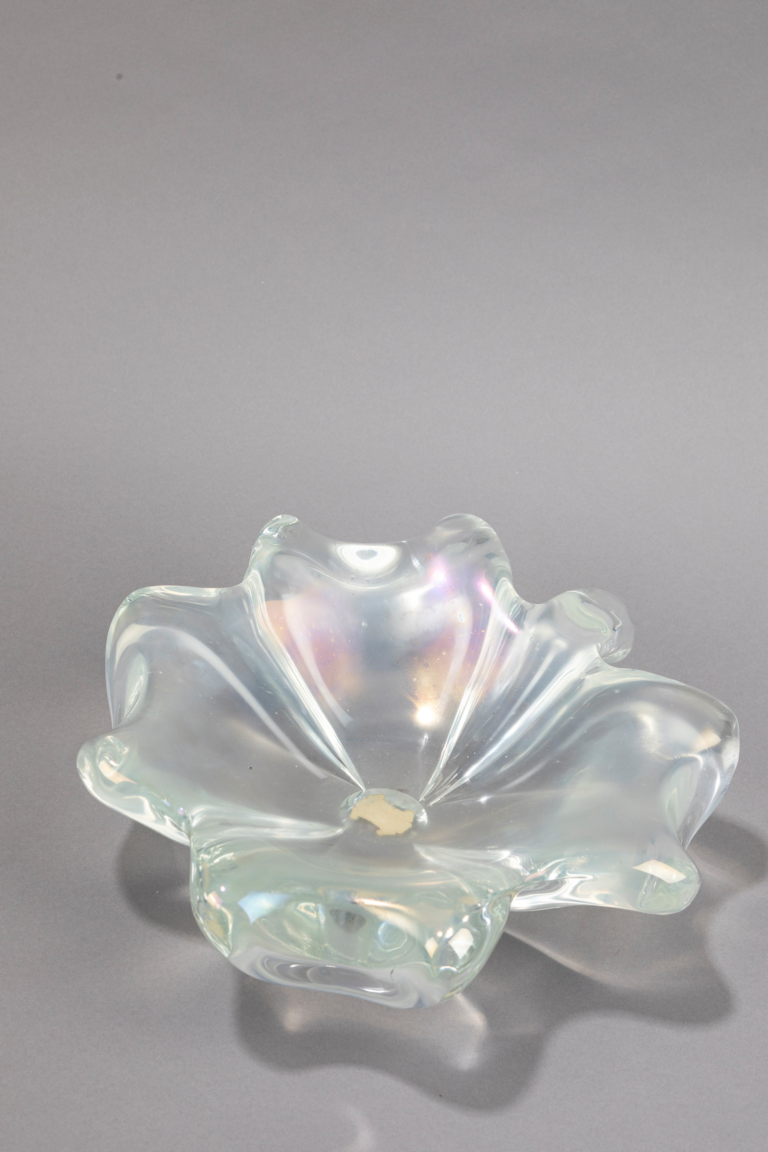 Centrotavola in vetro iridescente di grosso spessore. Etichetta originale. Produzione Barovier e Toso.