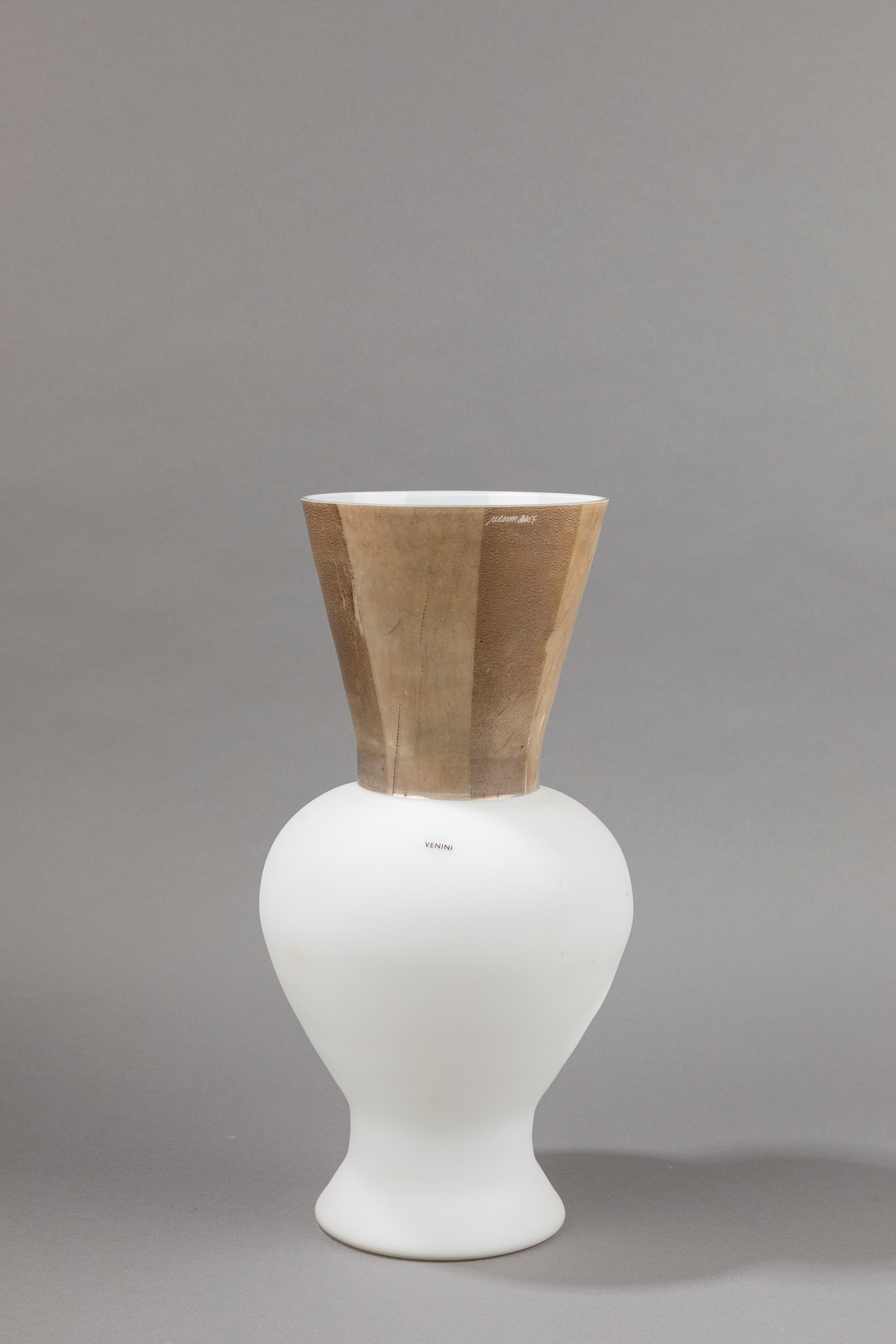 2007 Vaso della serie Principe-Re-Regina, in vetro opalino, decoro effetto metallo applicato a caldo e sabbiato. Produzione Venini. Etichetta originale.