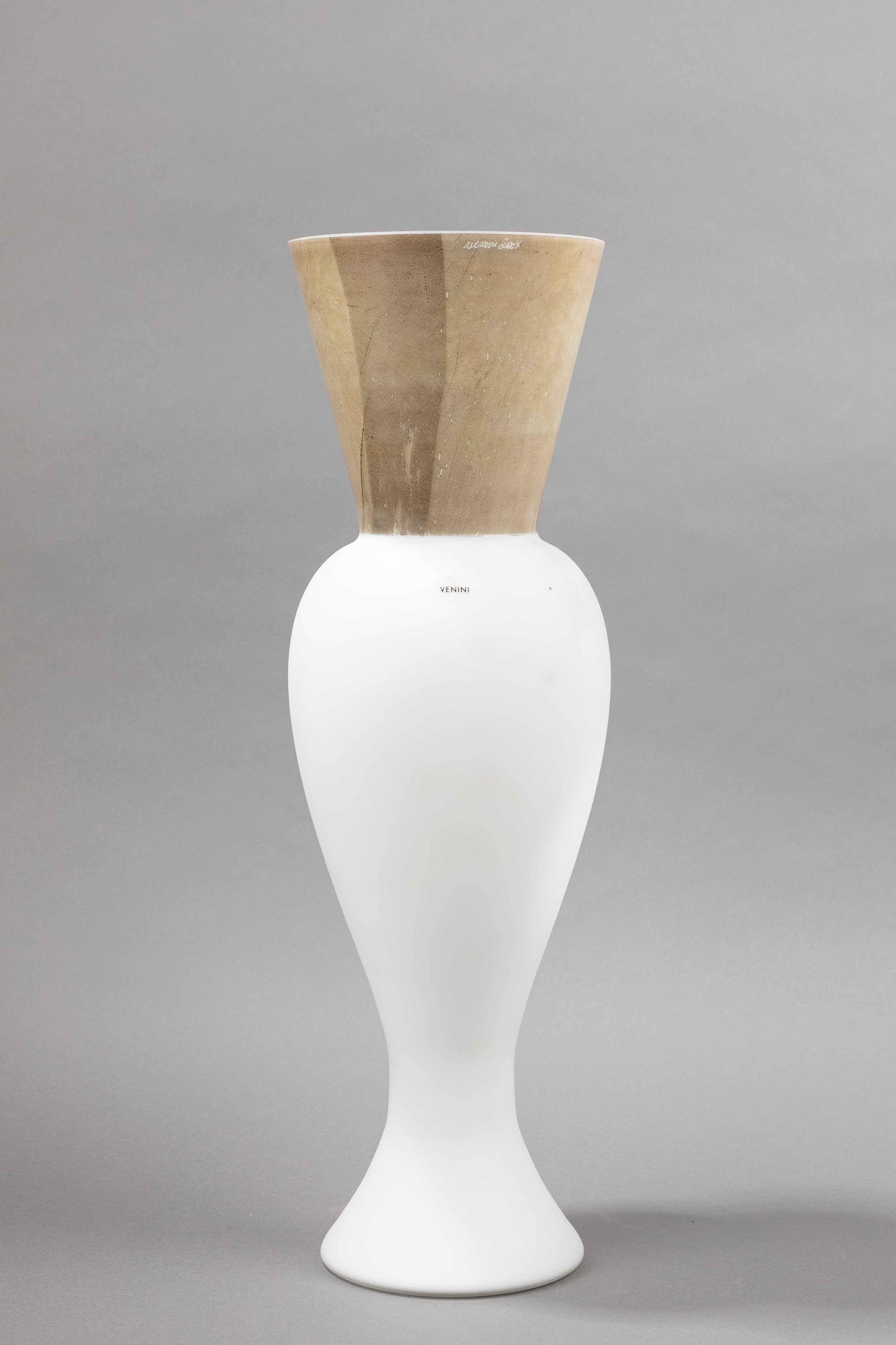 2004 Vaso della serie Principe-Re-Regina, in vetro opalino, decoro effetto metallo applicato a caldo e sabbiato. Produzione Venini. Etichetta originale.