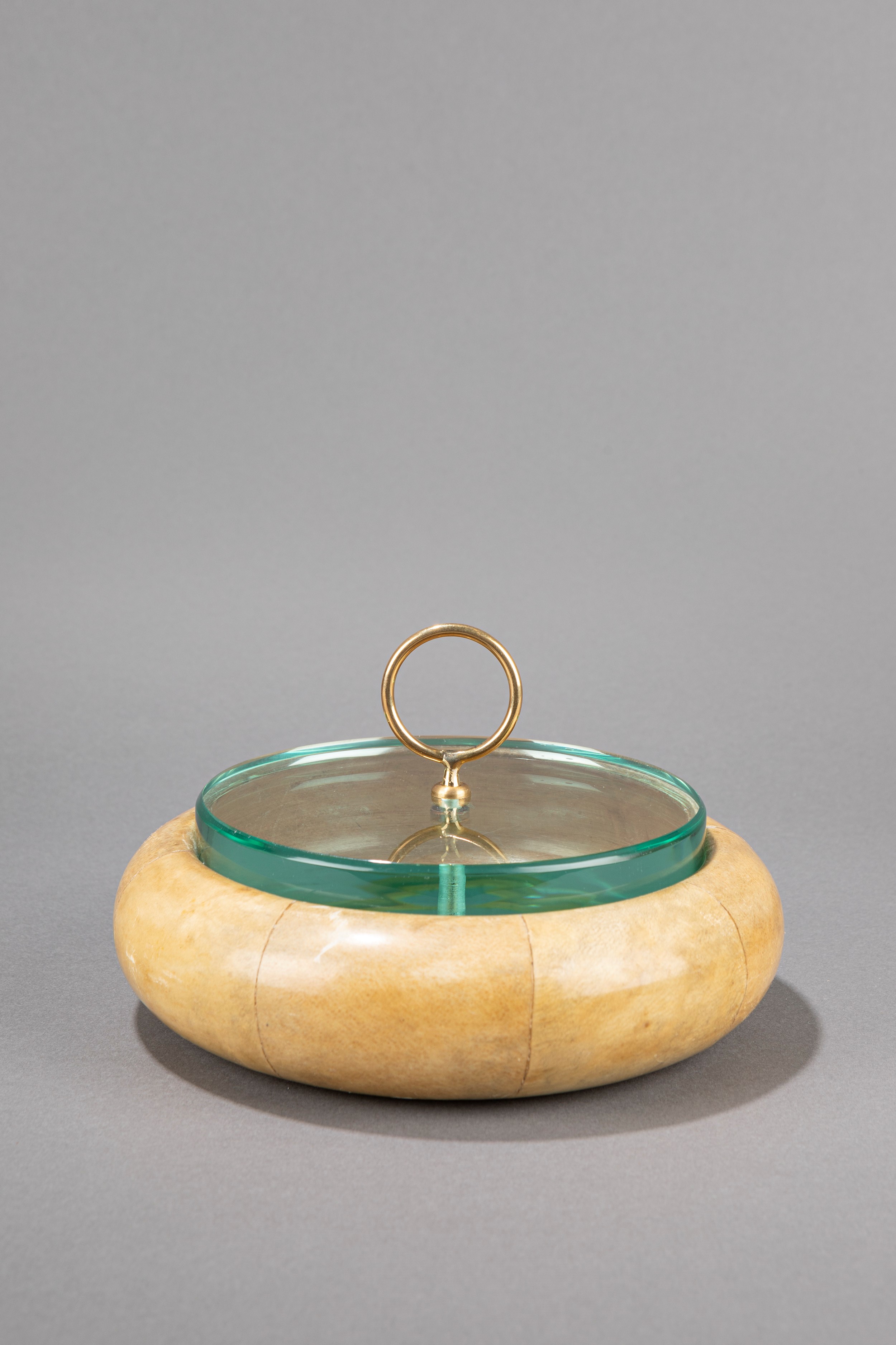 in pergamena con coperchio in vetro di grosso spessore e finiture in ottone.
