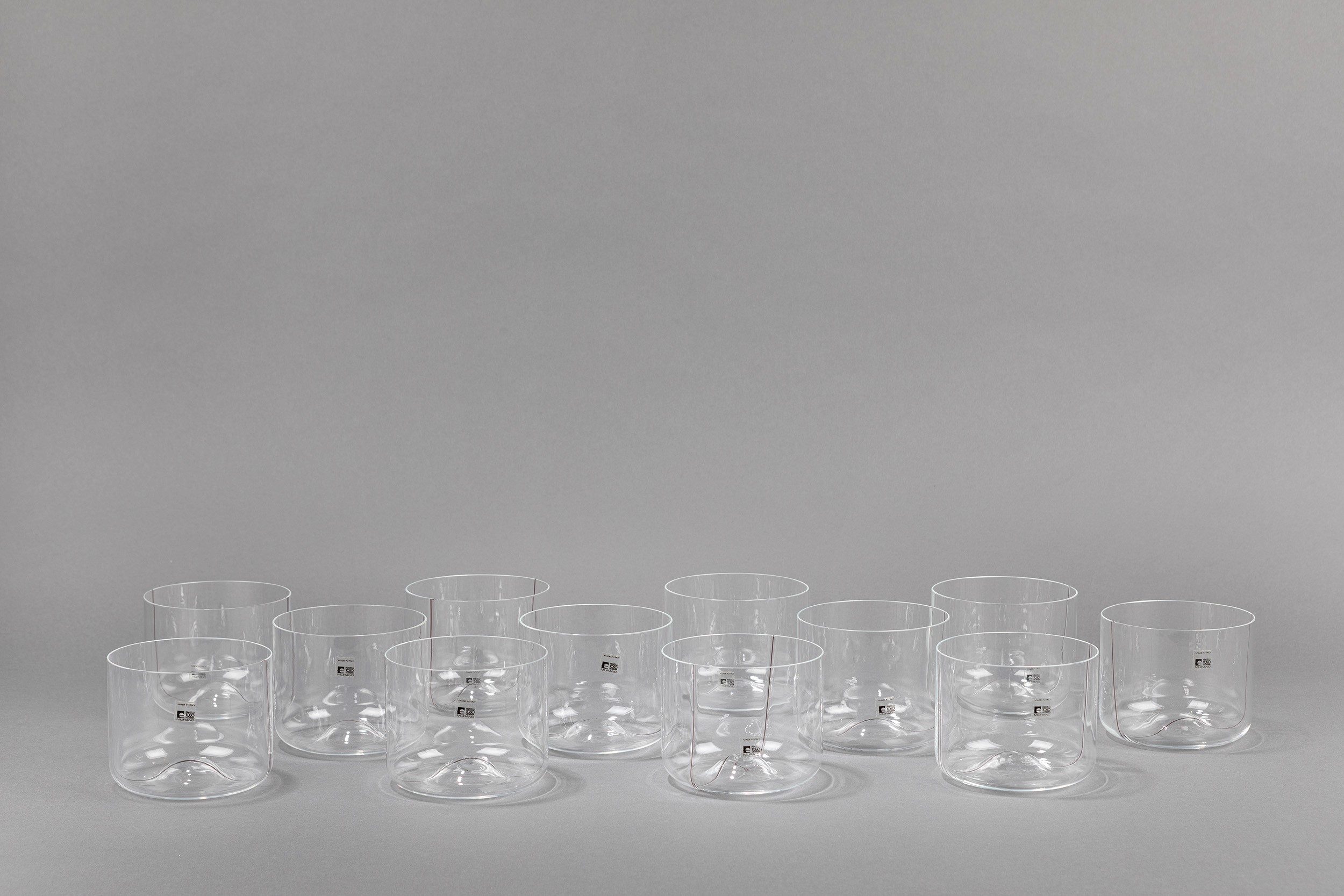 composto da 12 coppe in vetro soffiato con filo in vetro amaranto. Etichetta originale.