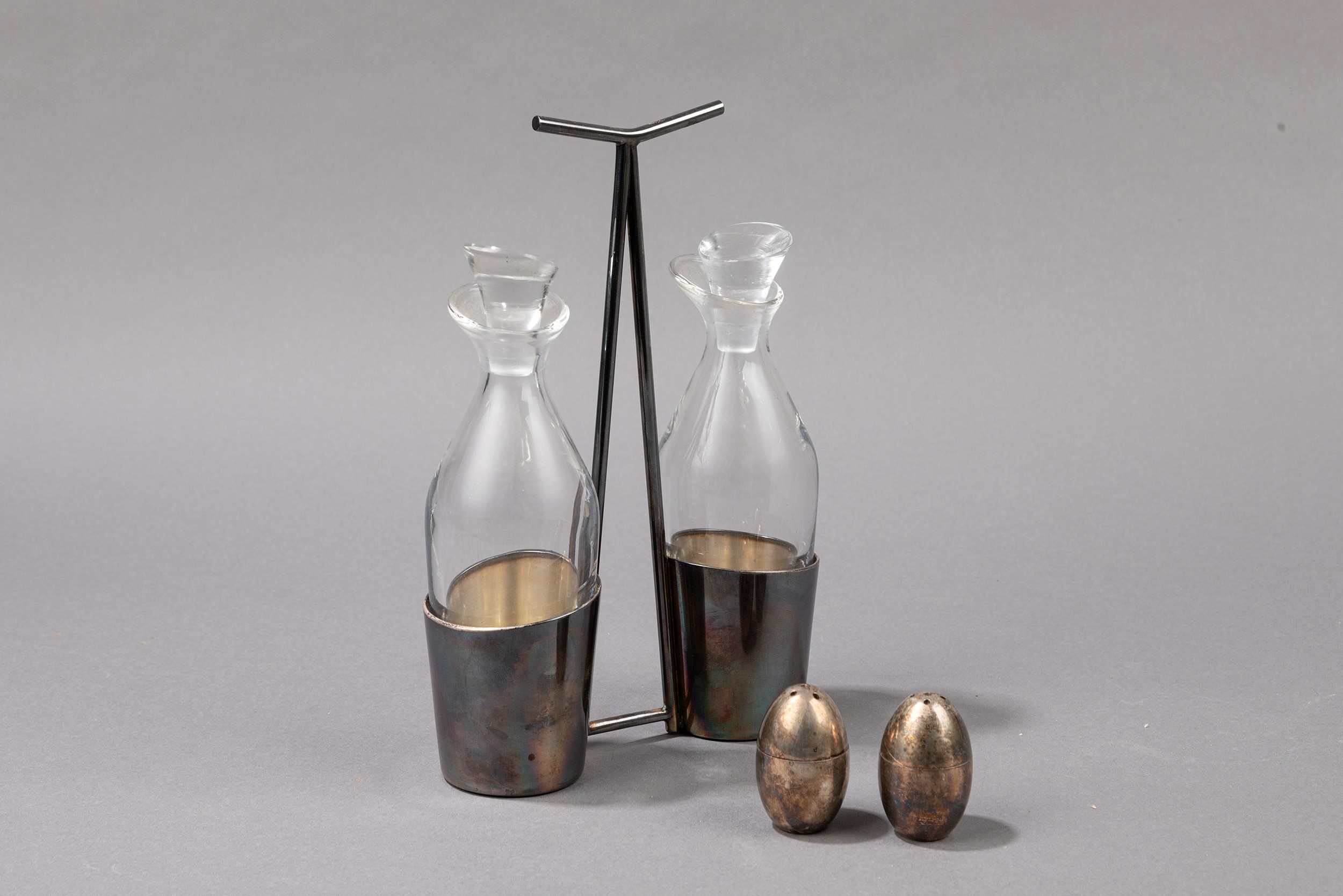 1950 ca. composto da un’acetoliera in metallo argentato e da saliera e pepiera. Produzione Gallia, Christofle. Marchio originale sull’acetoliera.