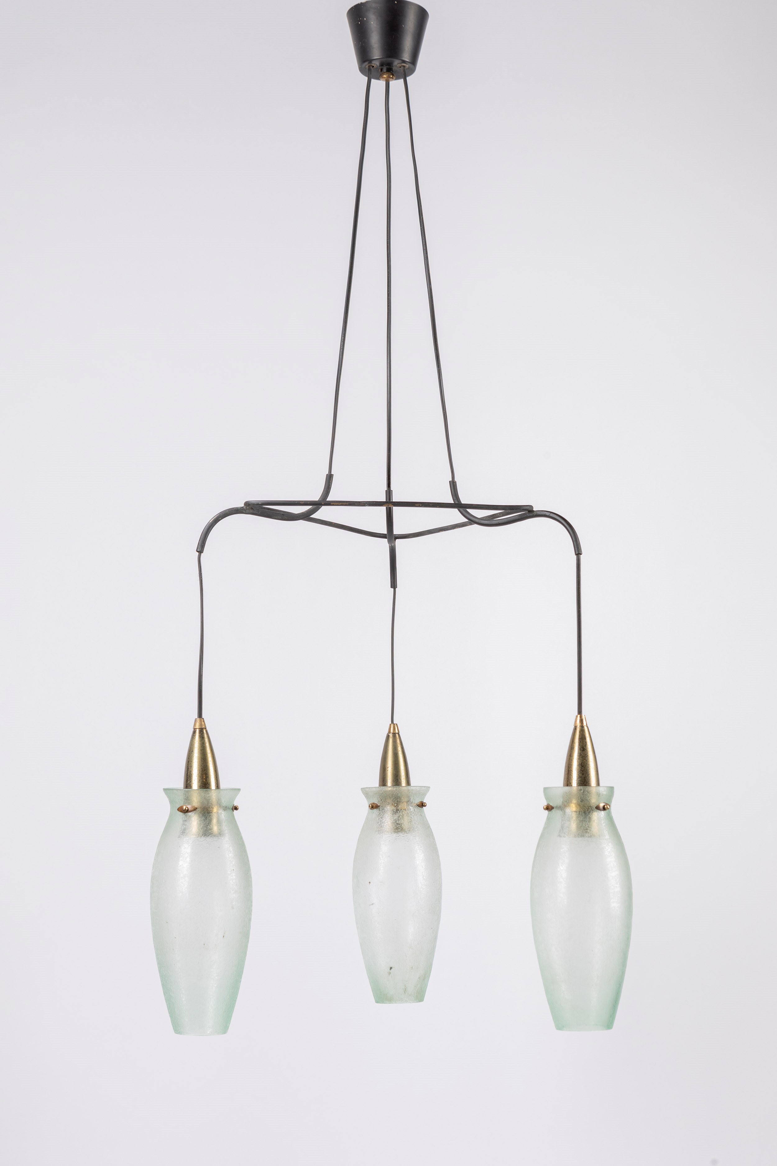 a tre luci in vetro corroso. Struttura in metallo e particolari in ottone.
