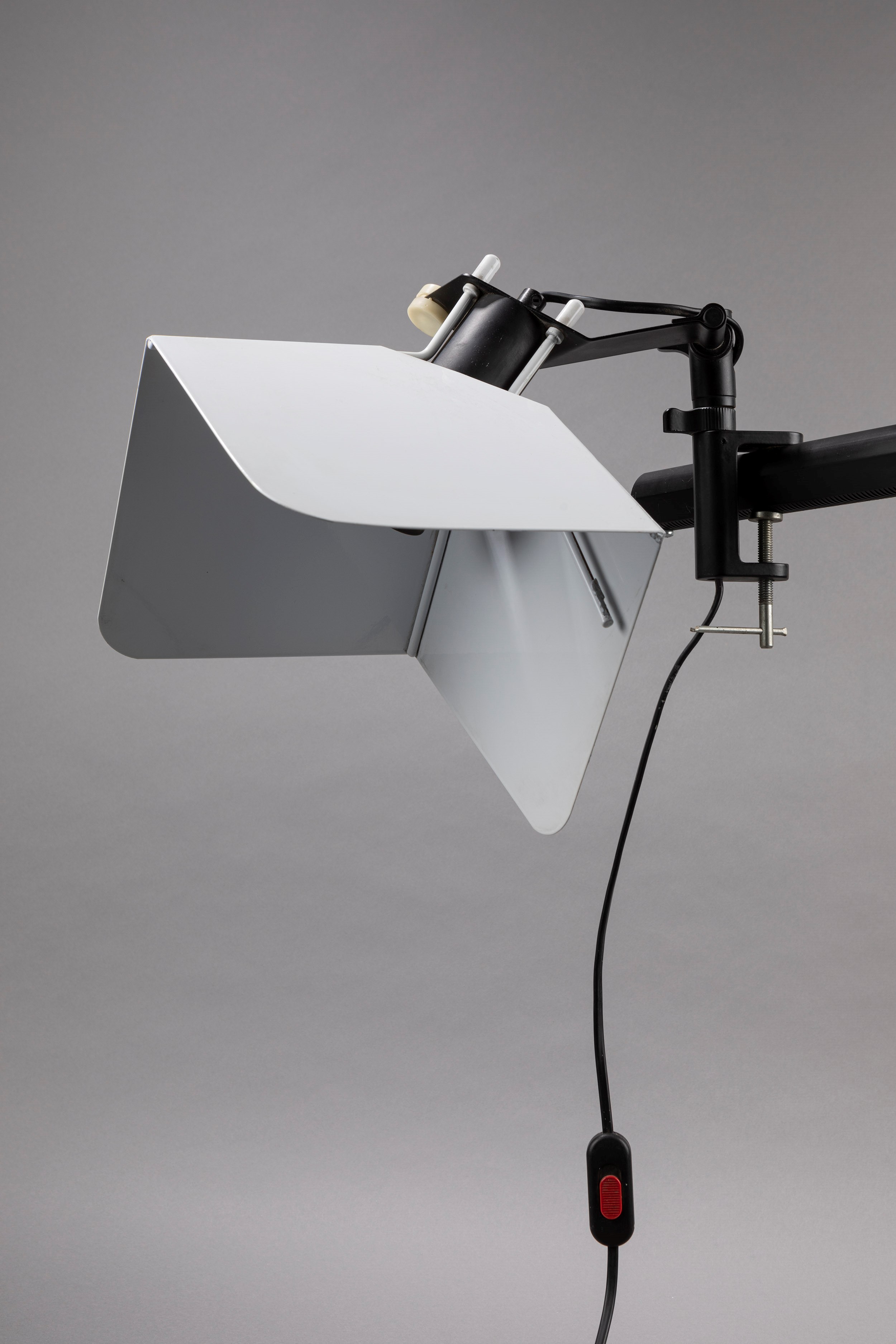 1970 ca. Lampada a morsetto con paralume in metallo sagomato e piegato in tre parti. Produzione Stilnovo. Etichetta originale.