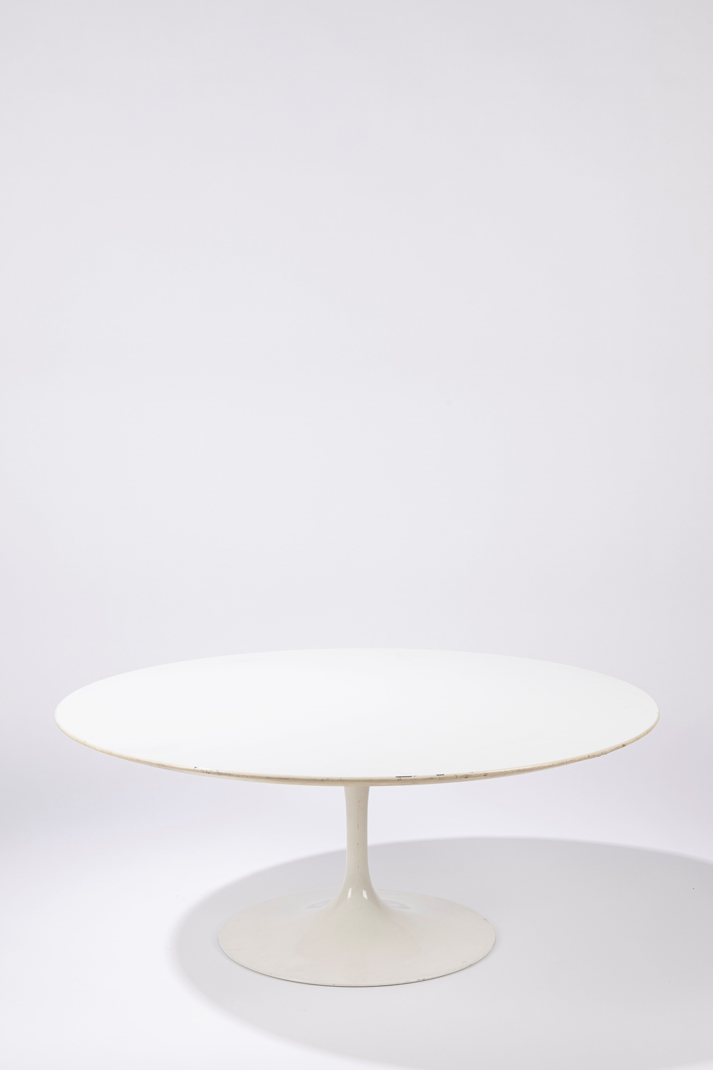 Tavolino con piano ovale in laminato e base in alluminio. Produzione Knoll. Marchio originale.