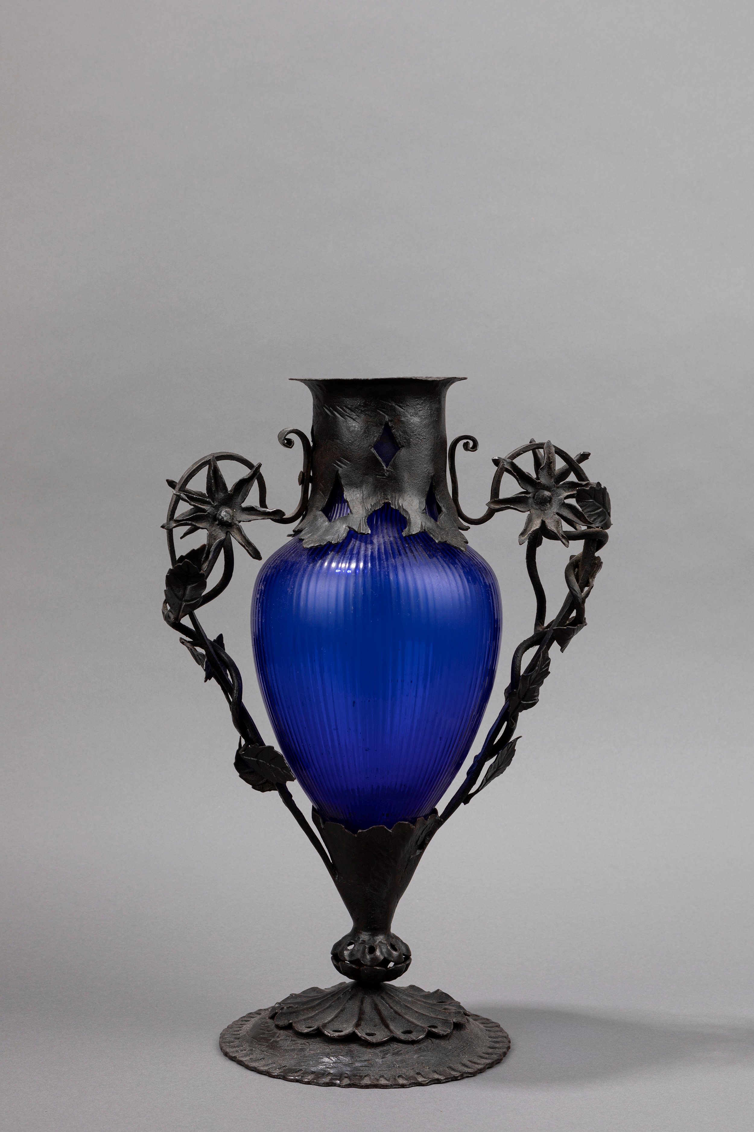 Connubio ferro e vetro soffiato di Murano; base a doppia ansa in ferro lavorato.
