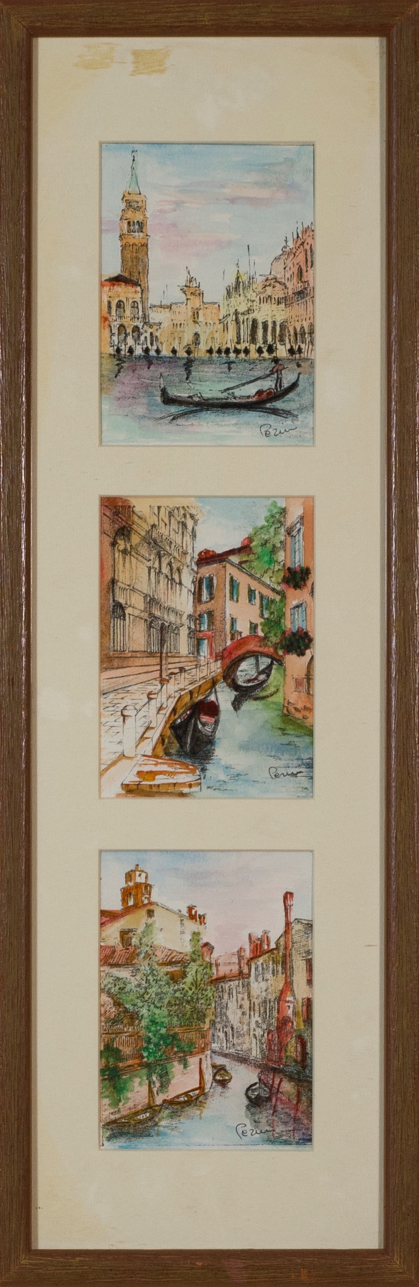 lotto di 3 acquerelli in unica cornice, cm. 14x10 cad.
